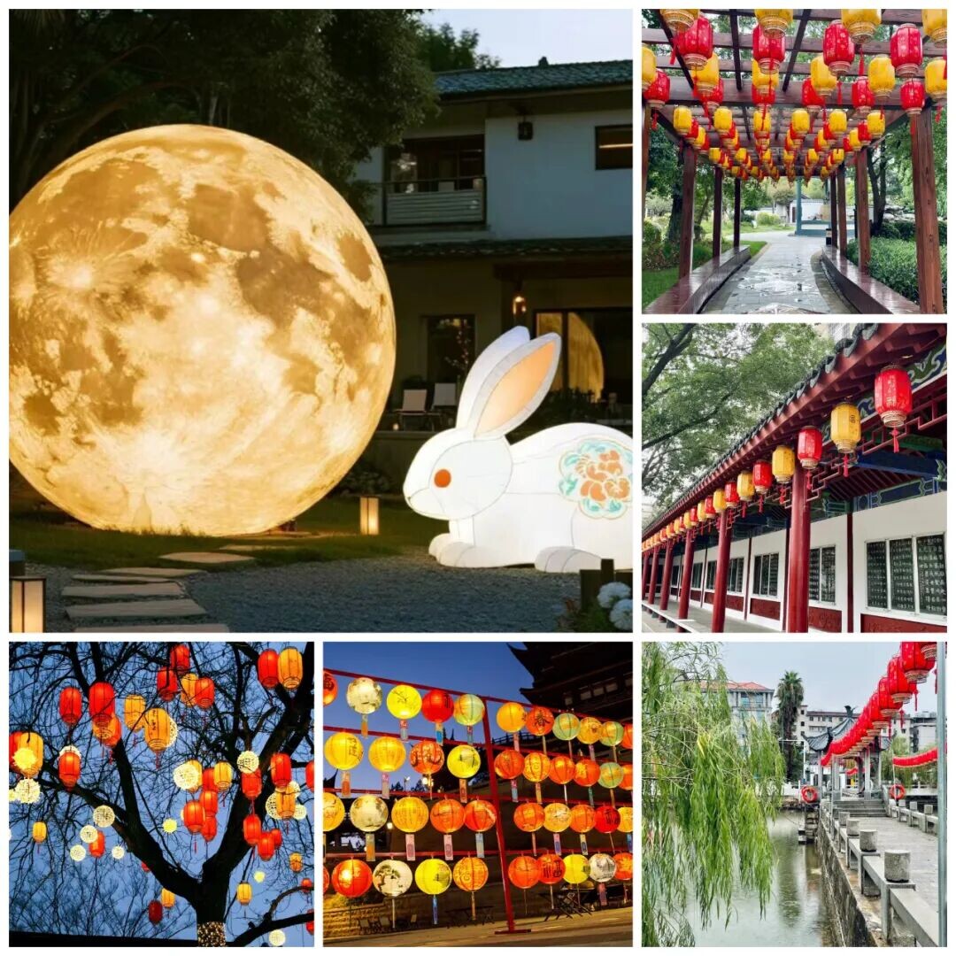 大型玉兔伴灯笼璀璨亮相,灯笼长廊流光溢彩,池中双月相映成趣(实景氛围感拉满,随手拍都是中秋大片。)