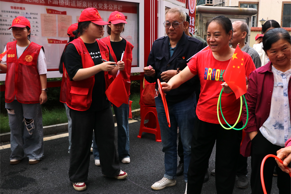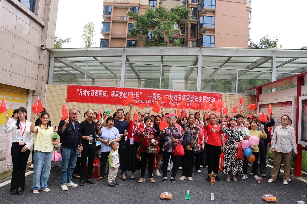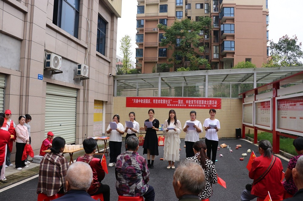 9月28日,湘南幼儿师范高等专科学校学前教育专业22级(五)18班全体同学与新泉社区退伍老兵、老党员、社区爷爷奶奶们“老少同堂”迎中秋庆国庆,开展“月满中秋迎国庆,邻里欢歌聚社区”主题活动,用青春志愿红向新中国成立76周年华诞献礼。