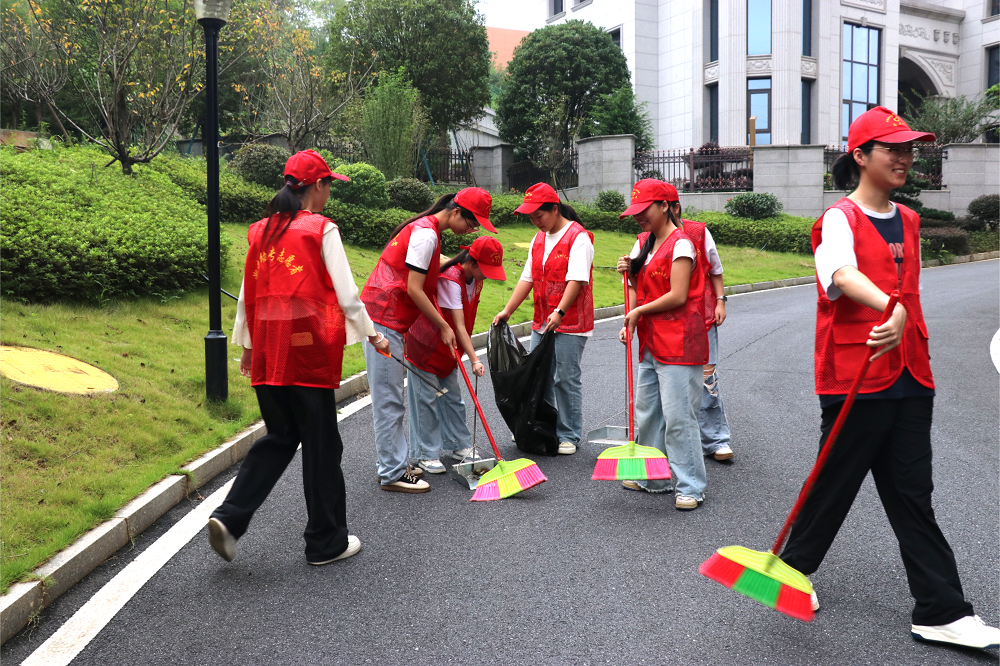 学前22级(五)18班的同学们身着志愿红马甲,化身为社区的“美容师”。他们手持清洁工具,细致地清扫着新泉社区的公共区域。弯腰拾起的不仅是纸屑落叶,更是一份对公共环境的社会责任;挥洒的汗水,浇灌的是热爱家乡、服务社会的种子。这抹跃动的“志愿红”,成为节日里最温暖的色彩,以实际行动为社区环境“焕新”,展现了当代大学生从“象牙塔”走向“社会大课堂”,将服务意识内化于心、外化于行的可贵品质。