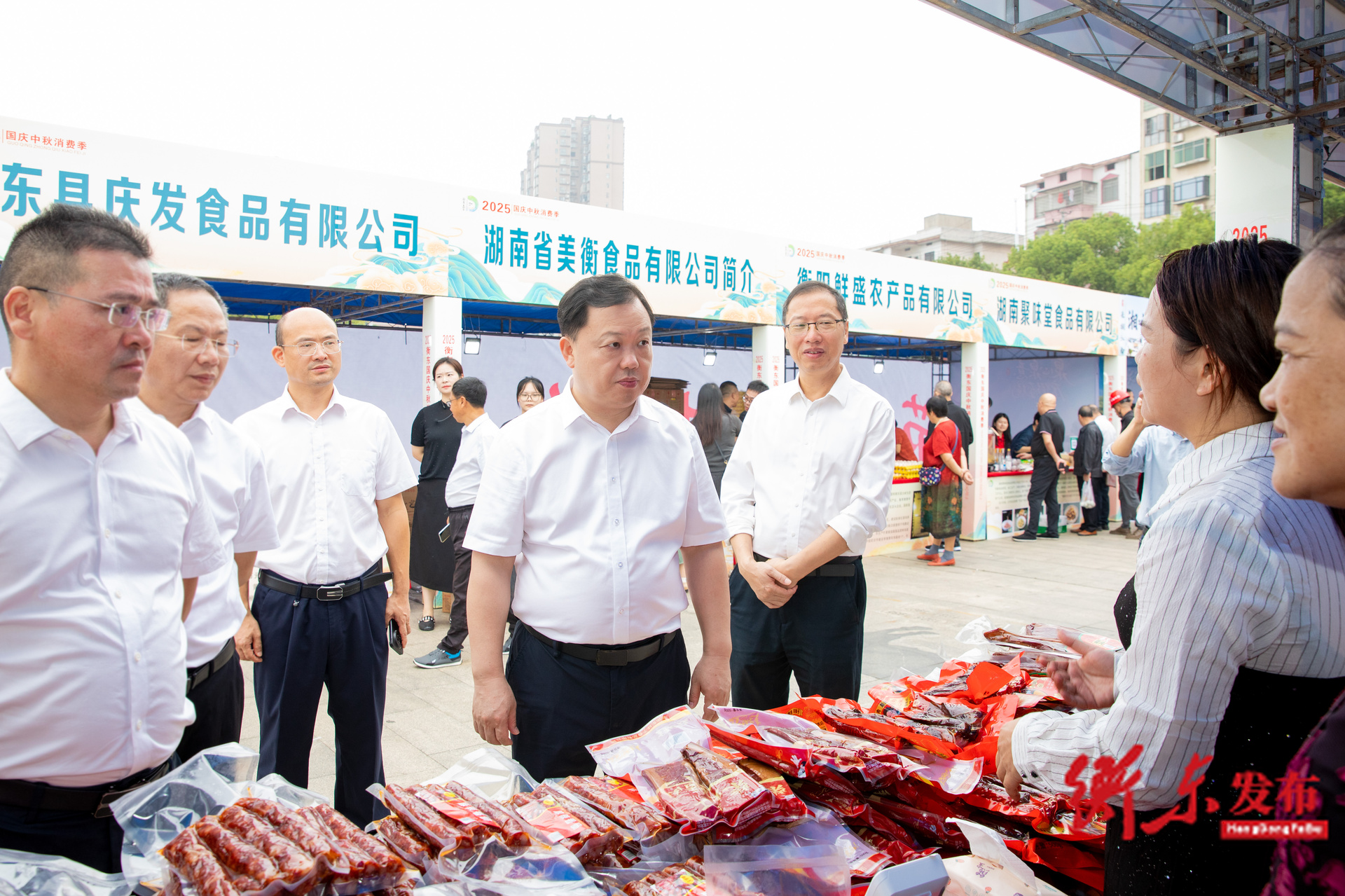 启动仪式后,谭建华一行实地参观了精品盆景文化艺术展与优质农产品展销周现场。在盆景展展区,他仔细欣赏造型别致的盆景作品,与参展的盆景艺术家亲切交流,详细询问盆景培育技艺、文化内涵及市场推广情况。谭建华强调,衡东拥有深厚的文化底蕴,盆景艺术作为传统园林文化的重要组成部分,是展现衡东生态之美与文化之韵的重要载体。要以此次盆景展为契机,进一步挖掘盆景文化价值,推动盆景艺术与文旅产业深度融合,让更多游客通过盆景认识衡东、爱上衡东。来到农产品展销区,谭建华逐一走访各个展位,查看衡东土菜预制菜、特色粮油、生态水果等展品,了解产品品质、价格及销售情况。他叮嘱相关部门与企业,要严把产品质量关,做好品牌包装与宣传推广,借助消费季平台拓宽销售渠道,让衡东优质农产品走向更广阔的市场,切实带动农民增收、农业增效。