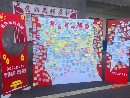 活动最后,学生们纷纷将祝福便利贴粘贴在“我爱我的祖国”主题展板上,一张张写有祝福的便利贴,凝聚成师生对家国双节的美好祝愿,成为活动中最温暖的一幕。