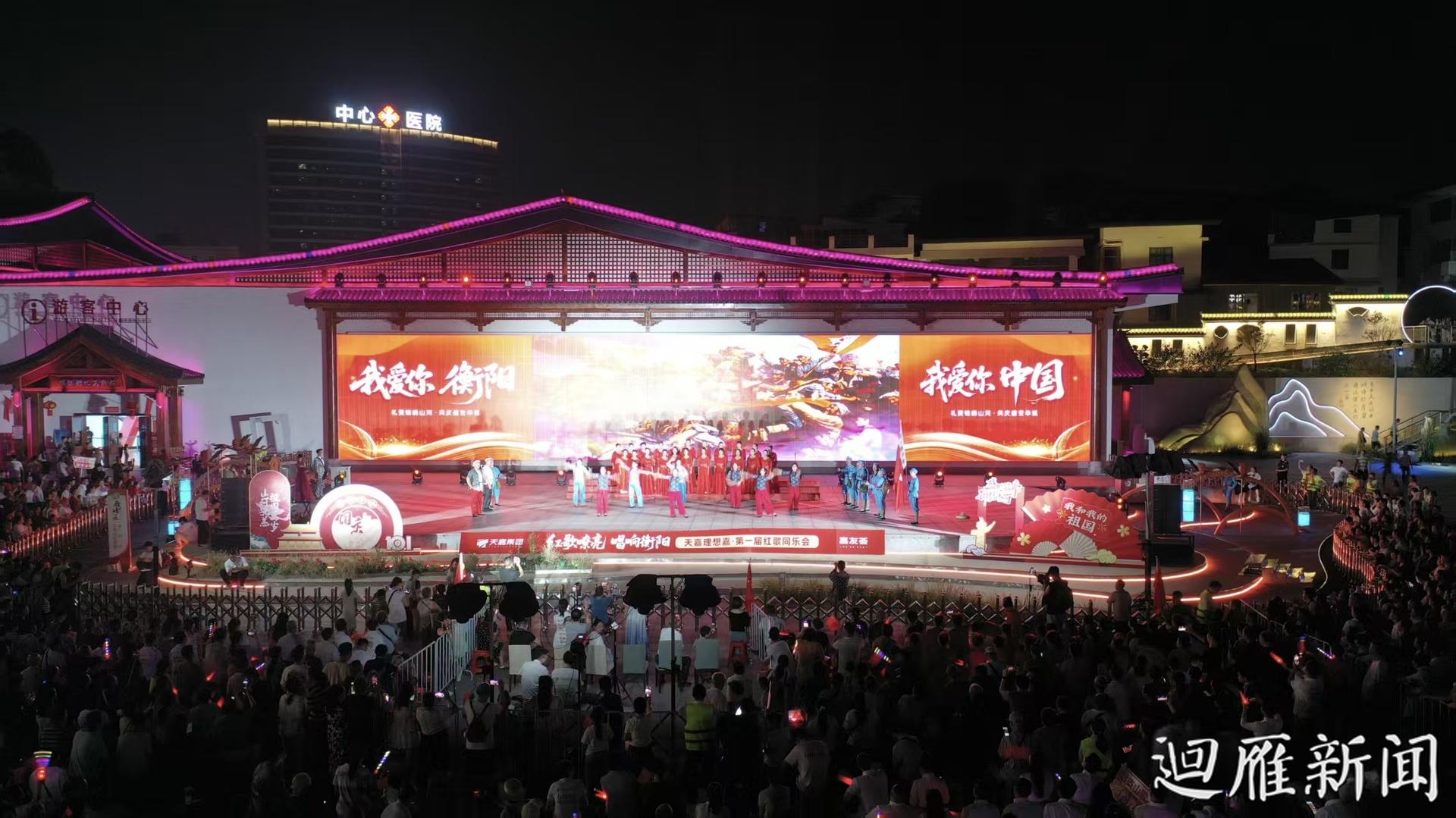 10月1日晚,雁峰区潇湘八景文化创意场华灯璀璨、掌声如潮,天嘉置业“红色歌曲嘹亮,唱响衡阳”主题红色歌曲会在此热烈开演。现场群众手持国旗,在激昂旋律中共同庆祝新中国华诞,用嘹亮的歌声传递对祖国的深情祝福。