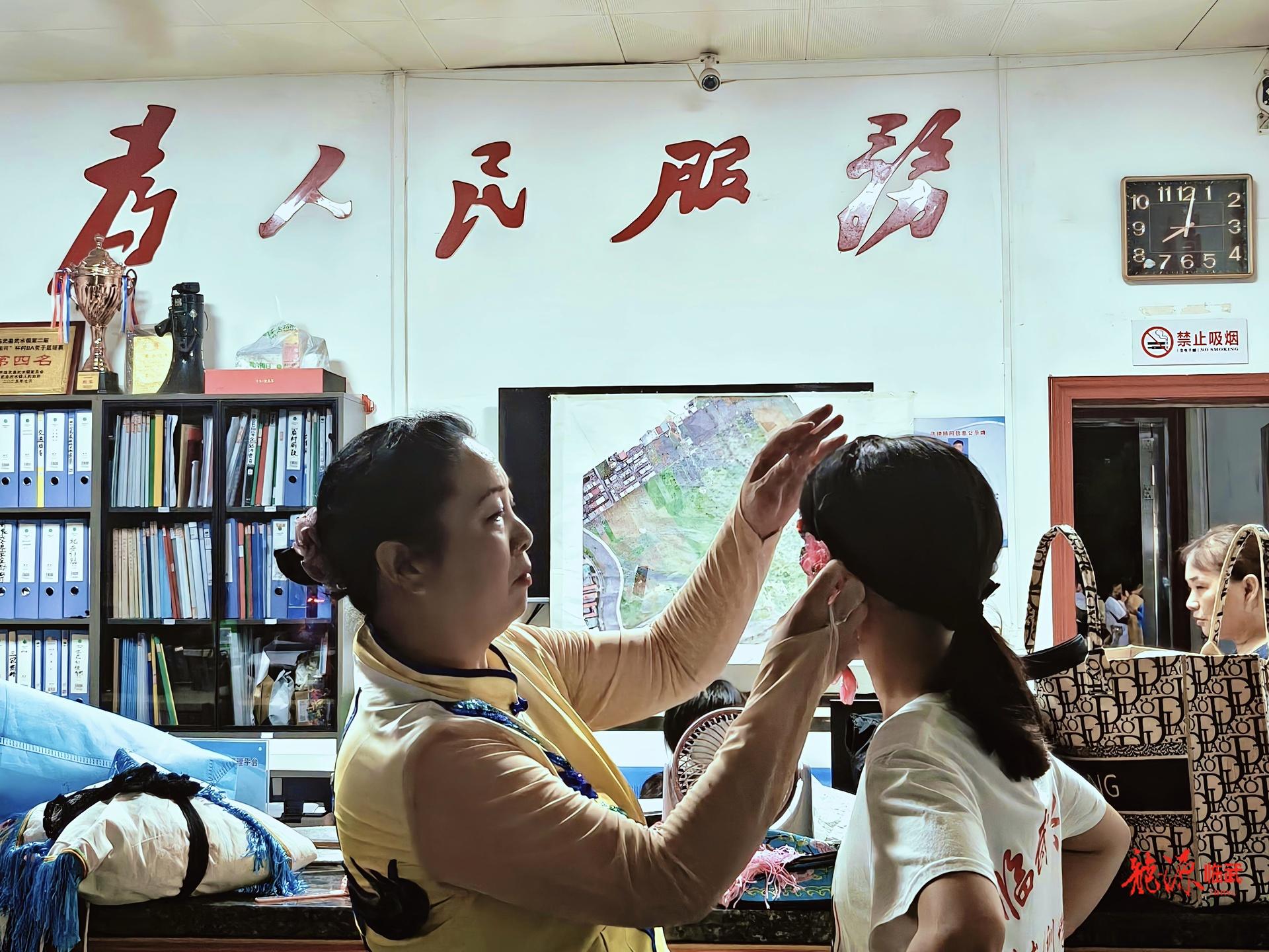 你看村委会,办公室变化妆室,风扇转悠转悠,换装、打底、描眉、上油彩、戴头饰……演员们忙得不亦乐乎,村干部接待得不可开交。