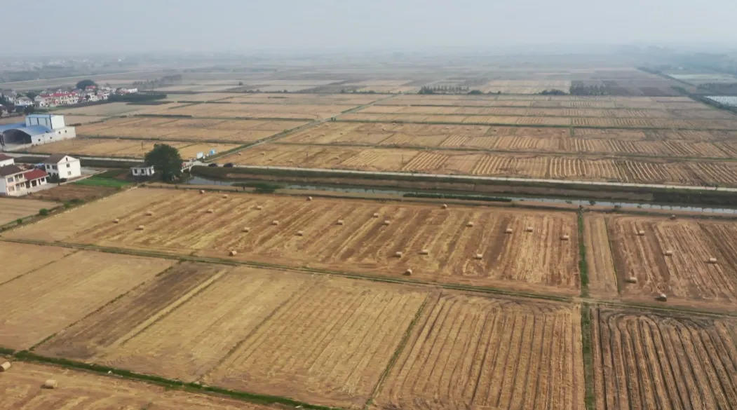 在汉寿县酉港镇富扬村这片刚刚收割后的稻田里,种粮大户熊耀华正在调度机械设备进行秸秆离田作业。随着两台8盘牵引式搂草机轰鸣作业,散铺在地面上的稻草立即被搂集成行。随后,大型圆滚打包机驶来,成行的稻草瞬间被吸走,随着旋转、压实、打捆,变成了黄橙橙的圆柱形稻草秸秆包,整齐码放在田间,田间地头立刻变得干净整洁。