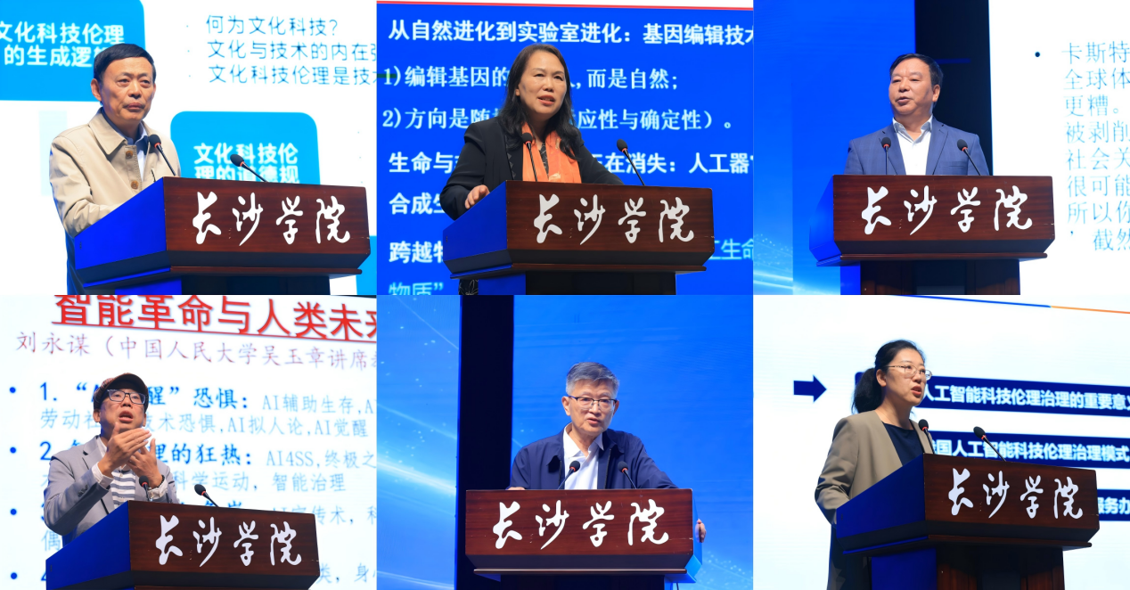 本次大会设一个主会场,三个分会场。主会场上,中国人民大学曹刚教授、复旦大学王国豫教授、上海大学孙伟平教授、中国人民大学刘永谋教授、上海大学肖峰教授、中国信息通信研究院副研究员毕春丽分别作了题为《文化科技伦理问题探究》《科技伦理的未来指向和治理路径》《论人机劳动权竞争的伦理后果》《智能革命与人类未来》《卓越的AI与安全的AI何以统一》《“人工智能+”科技伦理治理》的主旨报告;分会场分别由湖南师范大学、长沙学院、湘潭大学主办,来自各大高校的专家学者围绕文化科技融合数据伦理及其治理、“人工智能+”与智能向善理论、科技伦理教育与人才培养等主题展开了广泛交流和深入讨论,有力推动了文化科技伦理治理领域的学术交流与实践探索。