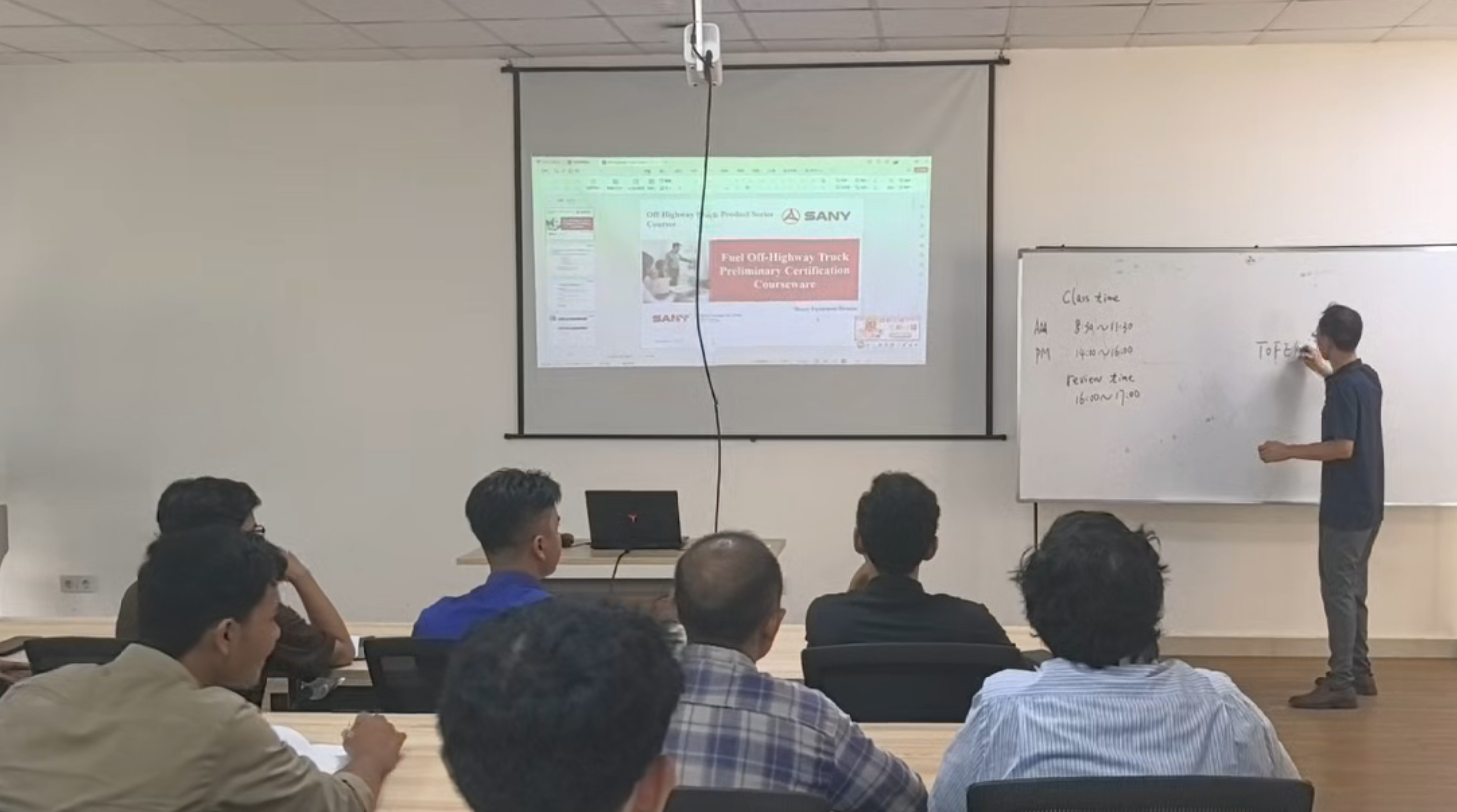 据了解,本次培训内容聚焦燃油宽体车全生命周期管理,涵盖燃油宽体车整车、发动机、传动系统、悬架系统、液压系统、电气系统等相关知识的培训。学员需完成全部理论学习与工厂实操,并通过“安全操作规范考核”“故障排除模拟赛”等环节方可获得初级认证。印尼学员阿尔迪表示:课程从基础原理讲到实操技巧,让我对设备维护更有信心。