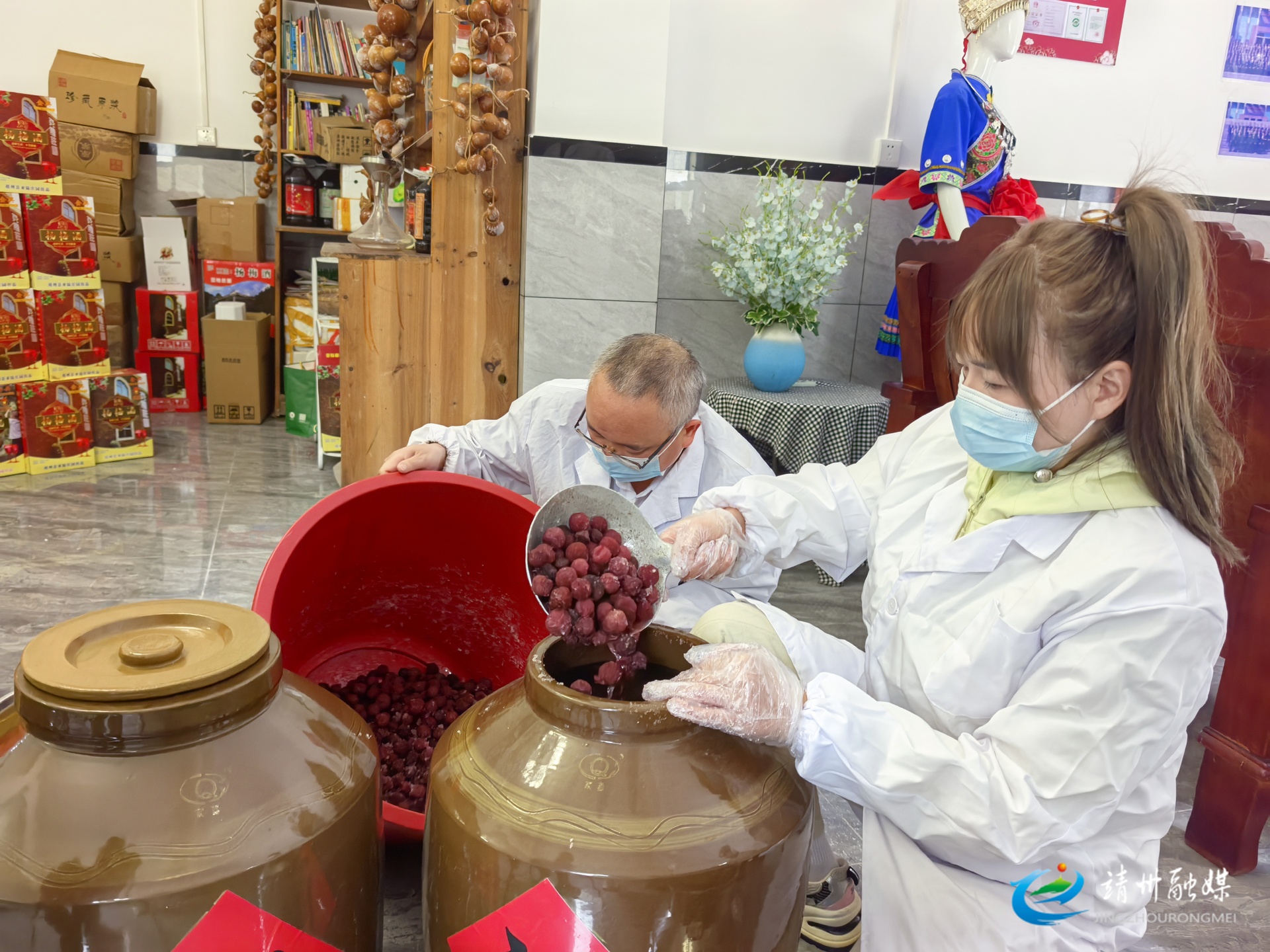 师徒二人正在把腌制好的杨梅装坛发酵(钦苏芬 摄)