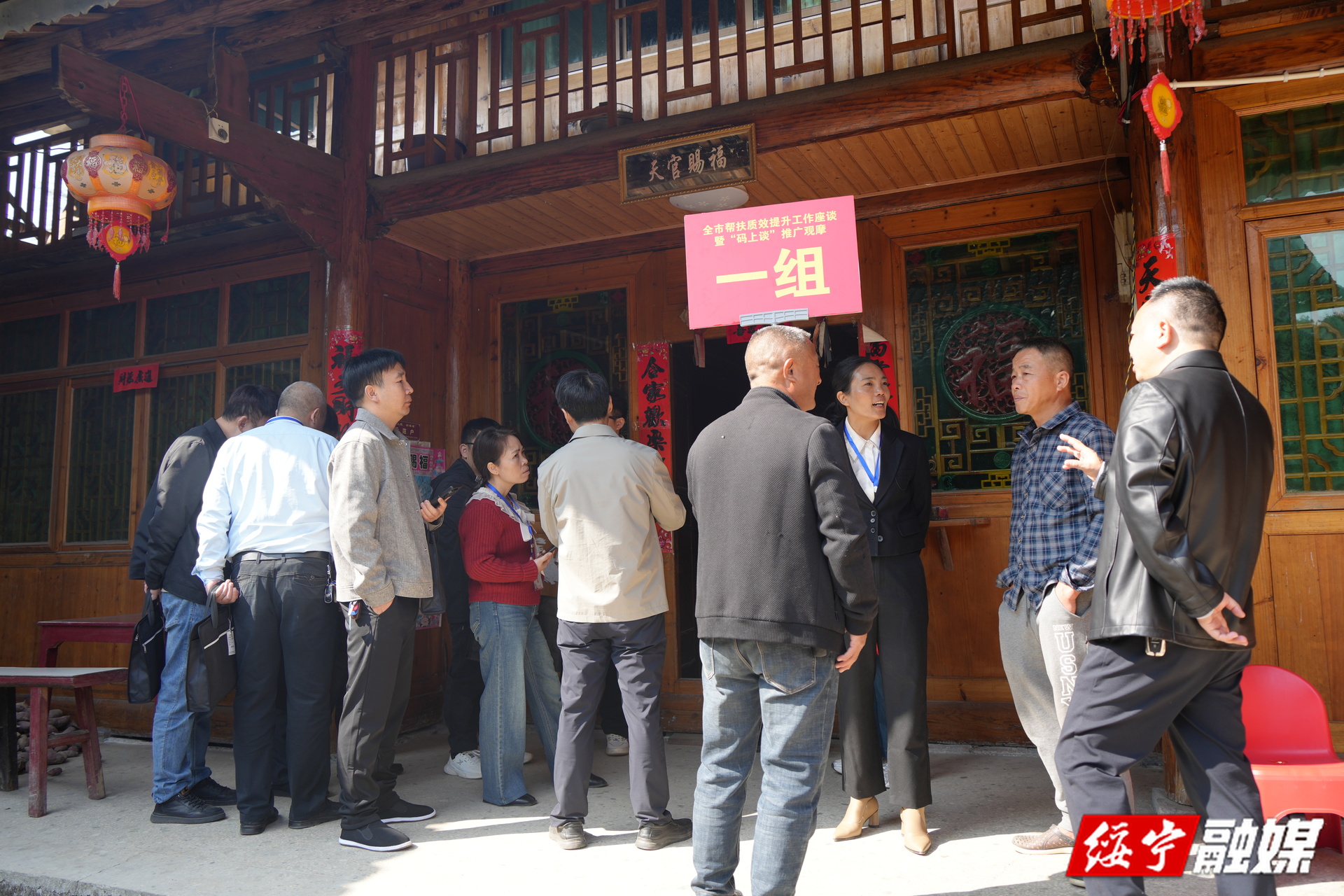 会前,参会人员来到乐安铺苗族侗族乡大团村大团侗寨,分组开展“码上谈”走访模式现场观摩,通过亲身体验和现场交流,实地考察该模式在基层实际应用中的运行情况。