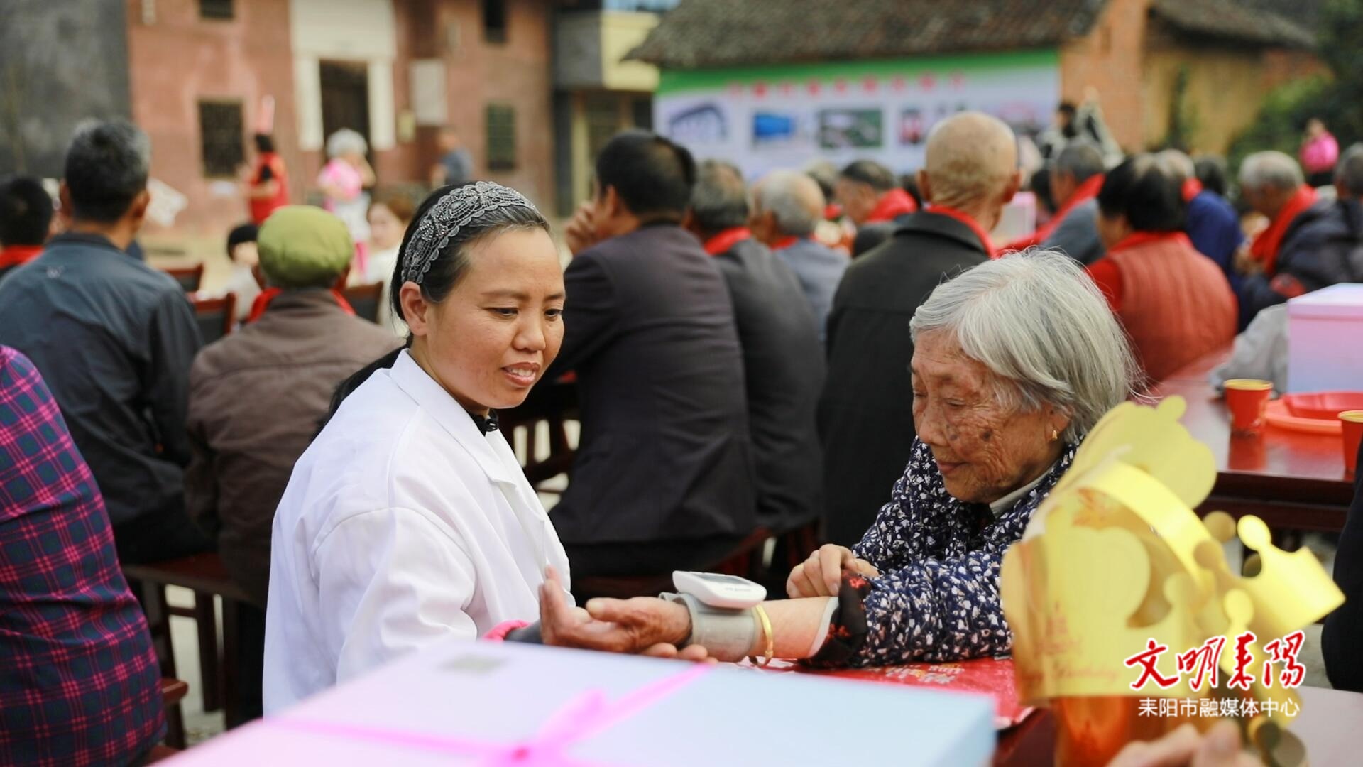 在文艺表演的间隙,乡村医生还为老人们测量血压、询问健康状况,并细心叮嘱用药与饮食注意事项,让健康服务走进节日现场。志愿者们忙前忙后,搀扶行动不便的老人入座、端茶递水、分发蛋糕,整个现场秩序井然、温馨感人。
