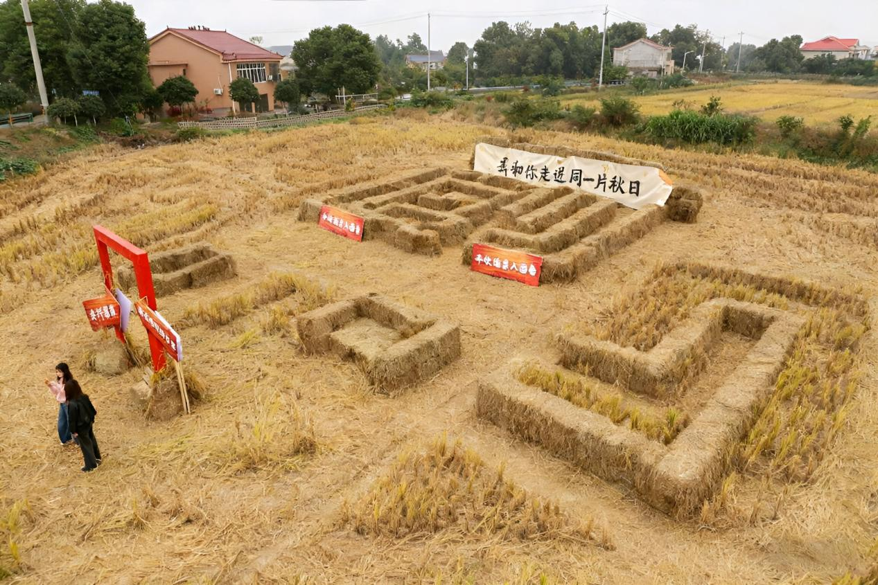 从图纸上的精心构思,到田野间的实干攻坚,这群“新农人”在设计图的指引下,搭建起一个占地60平方米的稻草迷宫。从底层框架的定位,到层层稻草的有序堆砌,再到高层结构的安全加固,每个环节都精益求精。最终,一座蜿蜒通道错落有致的稻草迷宫惊艳亮相,其中巧妙融入的红色“相框”造型与金色的草垛相映成趣,成为蓝塘寺村田间最亮眼的风景线,引得村民们纷纷驻足拍照。