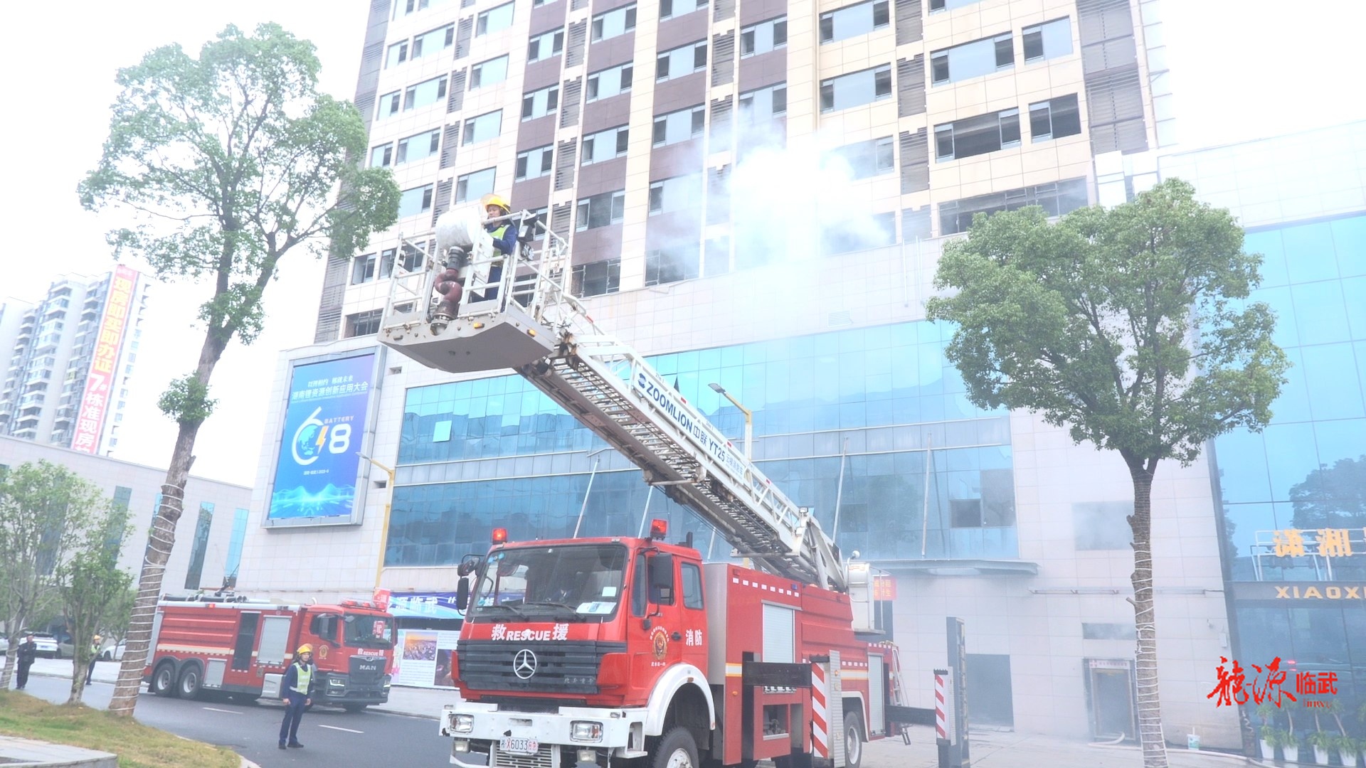 活动期间还组织开展了消防模拟演练。模拟场景设定为潇湘电影城某影厅突发火情,现场浓烟滚滚,楼内有人员被困,情况万分危急。县消防指挥中心接警后,迅速调集水罐消防车、云梯车、抢险救援车等8辆消防车赶赴现场,高效展开灭火、登高救援与险情处置,全面检验了消防救援力量的应急响应与协同作战能力。