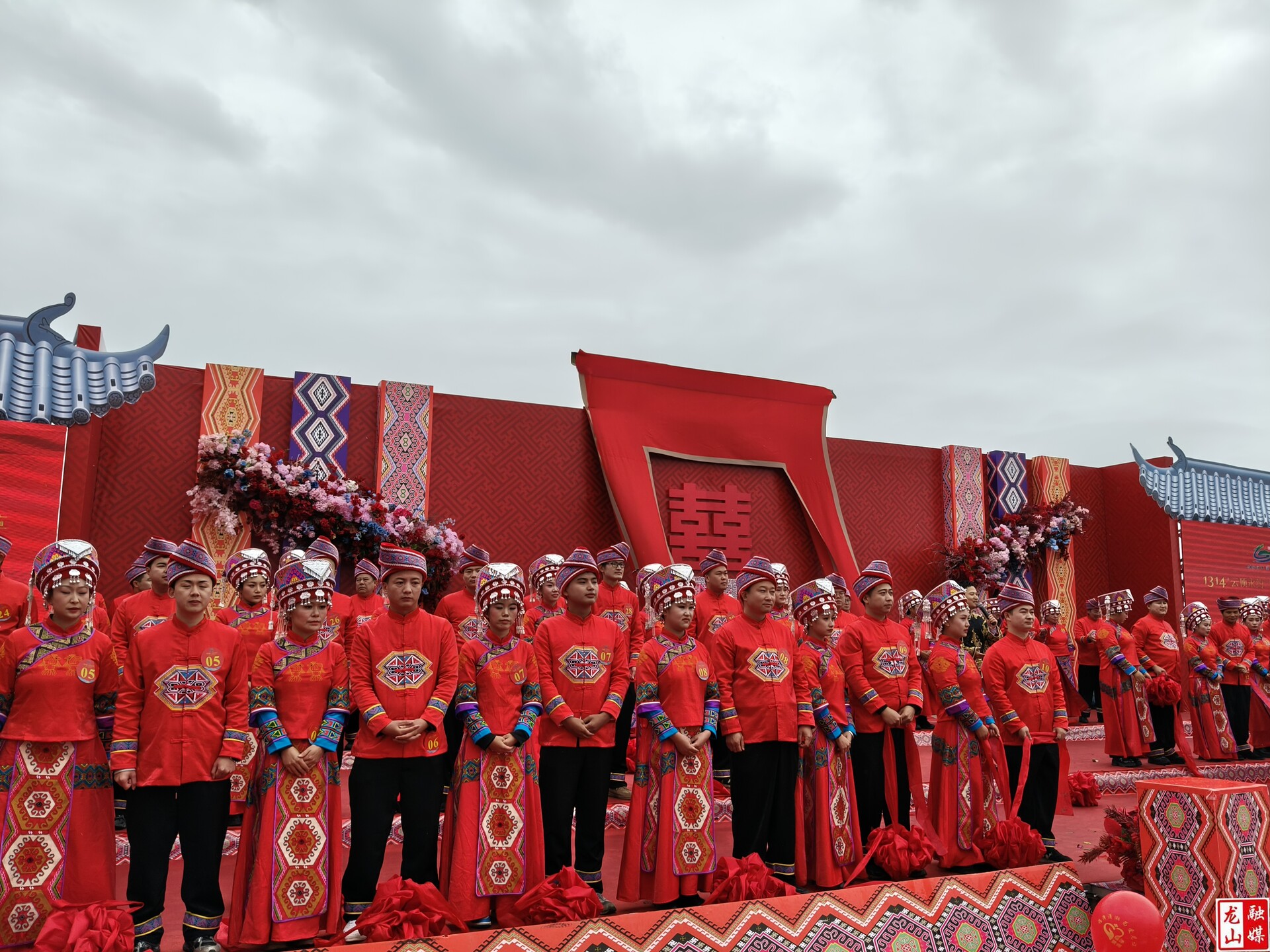 下午13:14,最受期待的集体婚礼仪式在1314观景台举行。主舞台融合土家族图腾与秦简元素,天空之镜的设计让新人仿佛置身云端,与身后翻涌的云海构成“山盟海誓,天地无涯”的绝美画卷。司仪深情开场后,50 对夫妇分为两组依次登台,逐一介绍姓名、籍贯并许下爱的宣言,真挚的话语感染着现场每一位观众。土家男女身着民族服饰为嘉宾敬酒,喜感十足;拜天地、夫妻对拜、宣读婚书、签订盟约、共饮合卺酒,一系列传统仪式环节庄重典雅,尽显对婚姻的敬畏与珍视。新婚夫妇代表分享爱情故事,传递对未来生活的美好期许;抛手花环节更是点燃全场热情,未婚嘉宾踊跃争抢,寄托对爱情的憧憬。随着全场合影的快门声响起,龙山县 “1314·云顶永约”八面山集体婚礼圆满礼成,大家尽情畅游观景台,定格幸福瞬间,分享参与集体婚礼的激动心情。