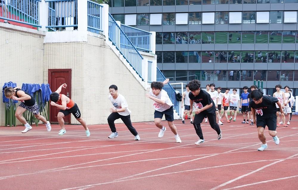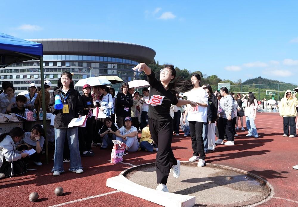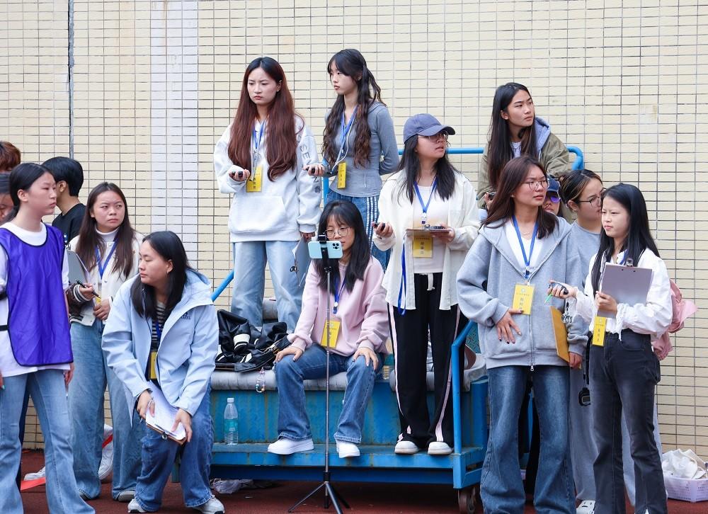 赛场内外,观众席上的加油声、呐喊声此起彼伏,班级旗帜与加油牌相映成辉,竞技氛围热烈而有序。赛事之余,诸多温暖场景让竞技赛场更具温度。在女子长跑项目中,一名落后的选手始终坚持奔跑,同班同学自发沿内场跑道全程陪伴,用呐喊与鼓励为她注入动力,最终她顺利冲过终点线,一句 “不想放弃班级荣誉”的哽咽感言,赢得全场掌声。