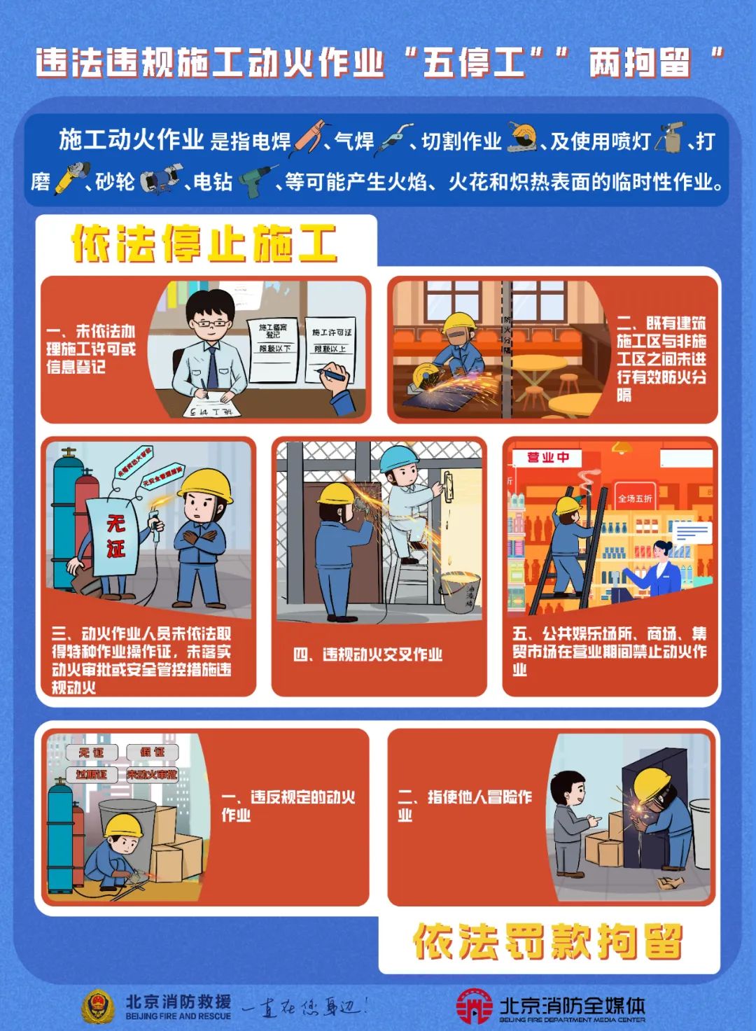 特别是既有建筑内改造、装修工程 工程量小、流动性强 自我安全管理容易松懈 更容易引发火灾事故 多起重大火灾事故都是由“小施工”引发的“大事故” 教训极为深刻 02 事故案例 2022年6月9日,杭州冰雪大世界发生一起火灾事故,造成4人死亡,2名消防员牺牲,19人受伤,建筑物过火面积600平方米,直接经济损失3057余万元。据事故调查结果,工人在杭州冰雪大世界进行消防管道维修时,违章电焊切割作业,熔渣引燃了位于杭州冰雪大世界二层冰雕区7-F立柱北侧与冰墙之间缝隙下部的掉落的管道保温材料残片和装饰装修材料。 2022年11月21日,河南安阳市凯信达商贸有限公司发生火灾,造成38人遇难。经过调查组的调查认定,这起特别重大火灾事故是由于企业老板在没有任何防护、没有任何培训、没有取得焊工证的情况下冒险作业违章电焊,高温的电焊火花掉落在货架上,先是引燃了聚氨酯泡沫填缝剂的纸质外包装,最后造成了聚氨酯泡沫填缝剂爆炸燃烧。 03 相关法律 《中华人民共和国消防法》 第二十一条禁止在具有火灾、爆炸危险的场所吸烟、使用明火。因施工等特殊情况需要使用明火作业的,应当按照规定事先办理审批手续,采取相应的消防安全措施;作业人员应当遵守消防安全规定。 进行电焊、气焊等具有火灾危险作业的人员和自动消防系统的操作人员,必须持证上岗,并遵守消防安全操作规程。 第六十三条违反本法规定,有下列行为之一的,处警告或者五百元以下罚款;情节严重的,处五日以下拘留: (一)违反消防安全规定进入生产、储存易燃易爆危险品场所的; (二)违反规定使用明火作业或者在具有火灾、爆炸危险的场所吸烟、使用明火的。 第六十四条 指示或者强令他人违反消防安全规定,冒险作业的,处十日以上十五日以下拘留,可以并处五百元以下罚款;情节较轻的,处警告或者五百元以下罚款。 各施工企业及现场动火作业人员 应当制定并落实动火作业管理制度 实施严格的火灾防范措施 登陆“企安安”进行线上备案,报告动火作业位置以及动火人、看火人等信息。 加强动火期间安全防范措施,焊接与热切割作业人员必须持证上岗,施工区与非施工区必须进行防火分隔,动火作业现场要专人看护、清理可燃物、配备消防器材。 落实动火作业视频监控,通过配备固定摄像头或使用手机等方式,对动火作业实施全程视频记录。 施工动火作业报备流程↓↓ 单位(场所)施工动火作业 消防安全操作规程↓↓ 违法违规施工动火作业 “五停工”“两拘留”↓↓