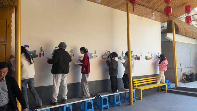 21日上午,师生们一下车就携带画具颜料奔赴工作点投入创作。面对大幅的墙面和复杂的构图,团队进行了精心设计和现场勾勒。创作期间,师生们展现了极高的敬业精神和专业素养,他们默契配合,精益求精。