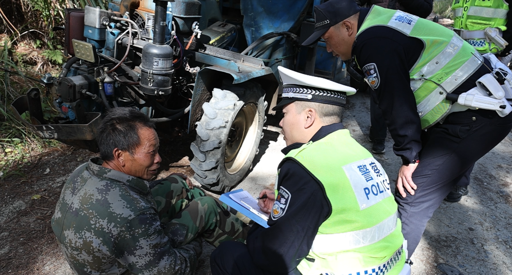 此次演练设置联合收割机倒车伤人、拖拉机行驶碾压两个场景。在寨前镇中心村演练现场,随着模拟事故信号发出,演练队伍迅速响应,县农业农村局、交警大队、应急管理局、人民医院等参演人员按照预案分工开展现场警戒、伤员救治、事故勘查、农机处置等流程,各环节衔接有序、高效配合。在大塘镇春风村拖拉机碾压事故模拟演练中,救援人员快速完成现场事故勘查、伤员转移、现场保护等处置,充分展现了应急队伍的专业素养和协同作战能力。
