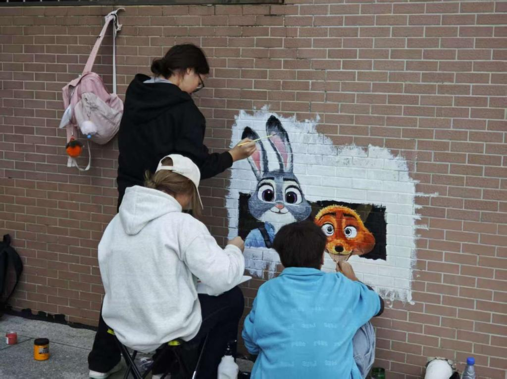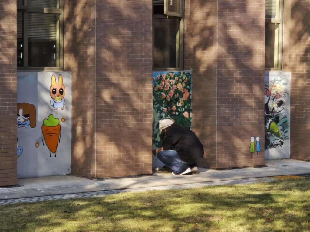 该活动以党员先锋为引领、团学干部为骨干,聚焦理想信念引领与校园文化建设,紧扣时代主题与青春内涵创作内容。团队成员发挥专业所长、分工协作,历时一周完成15个老旧墙面焕新改造,将斑驳单调的灰色空间升级为格调向上的文化景观。作品落地后迅速引发校园热潮,累计吸引师生驻足打卡1.8万余次,收到师生留言200余条,成为传递正能量、涵养品德修养的育人场所。