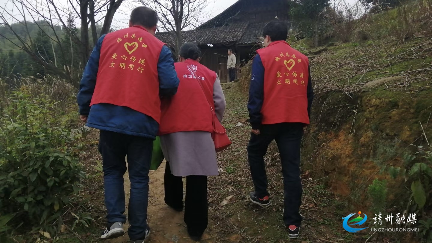 志愿者搀扶着周仁翠走访学生(志愿者协会供图)