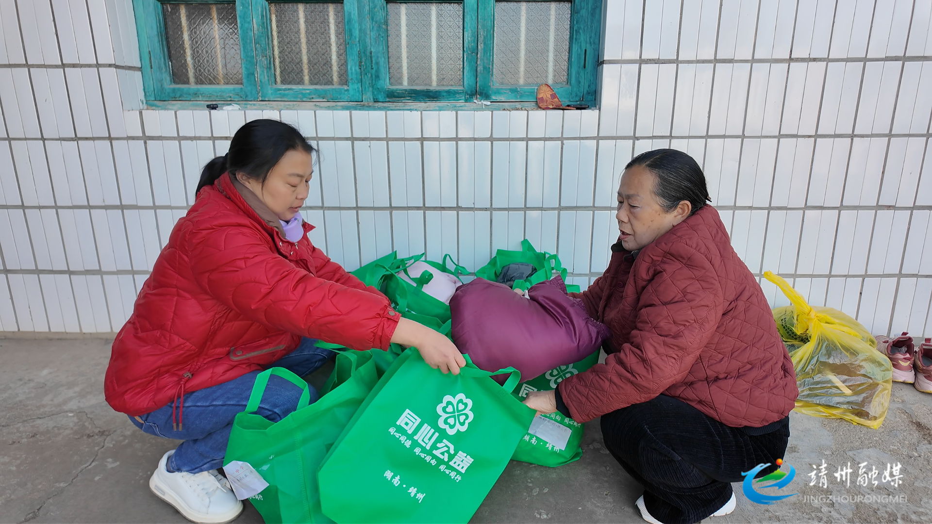 蔡春娟和周仁翠一起整理物资(孙文月摄)