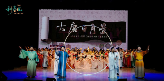 作为开幕演出,原创音诗画舞台作品《大唐日月星》在星河剧场隆重公演。该作品是学校“出画入戏——古画复活”文化IP系列的第四季力作,聚焦《唐宫仕女图》,以“以画为骨、以诗为魂”的理念,通过李白、杜甫作为画境导览人,将《捣练图》《虢国夫人游春图》等经典唐画串联成一场跨越千年的诗画对话。