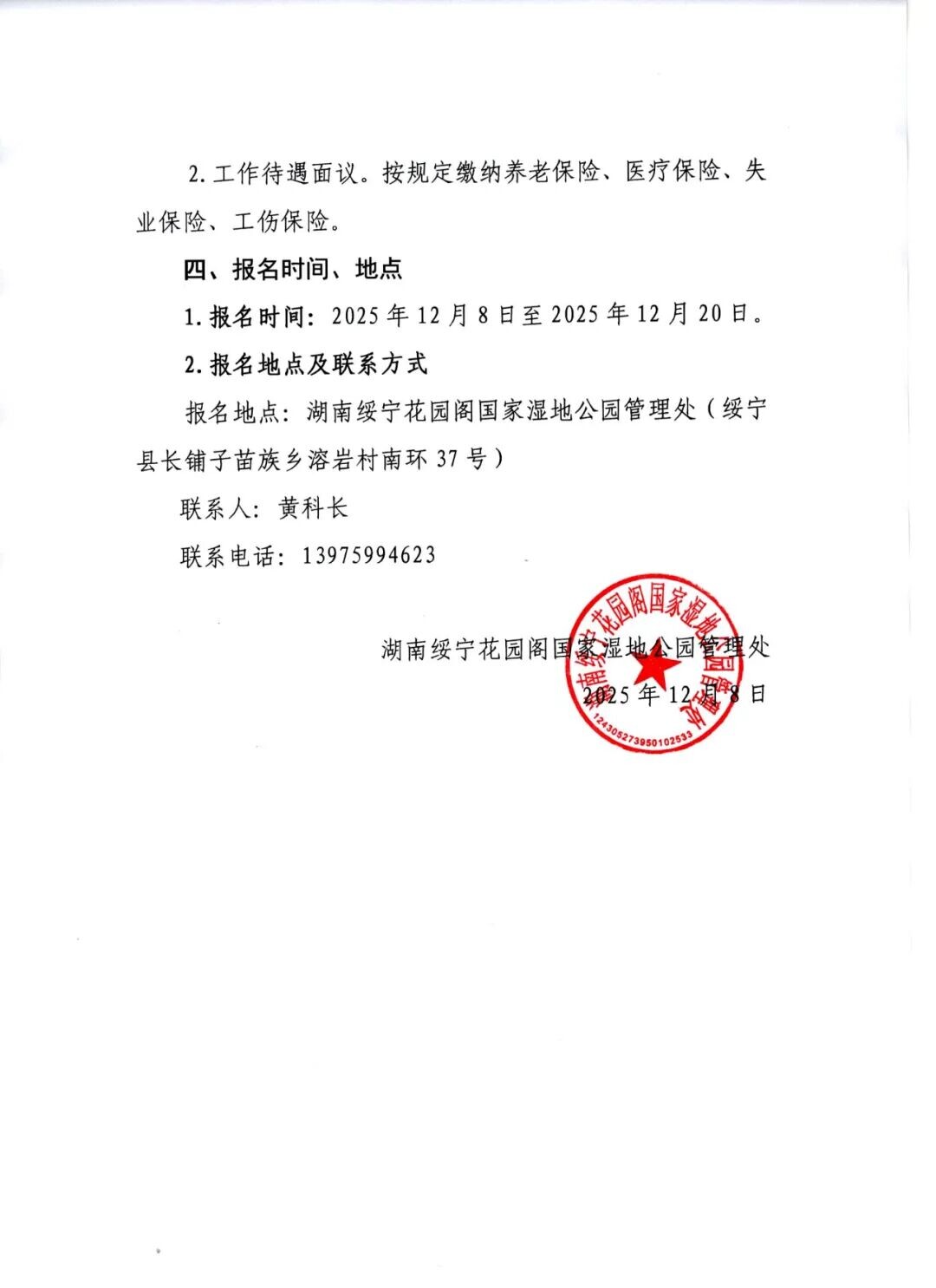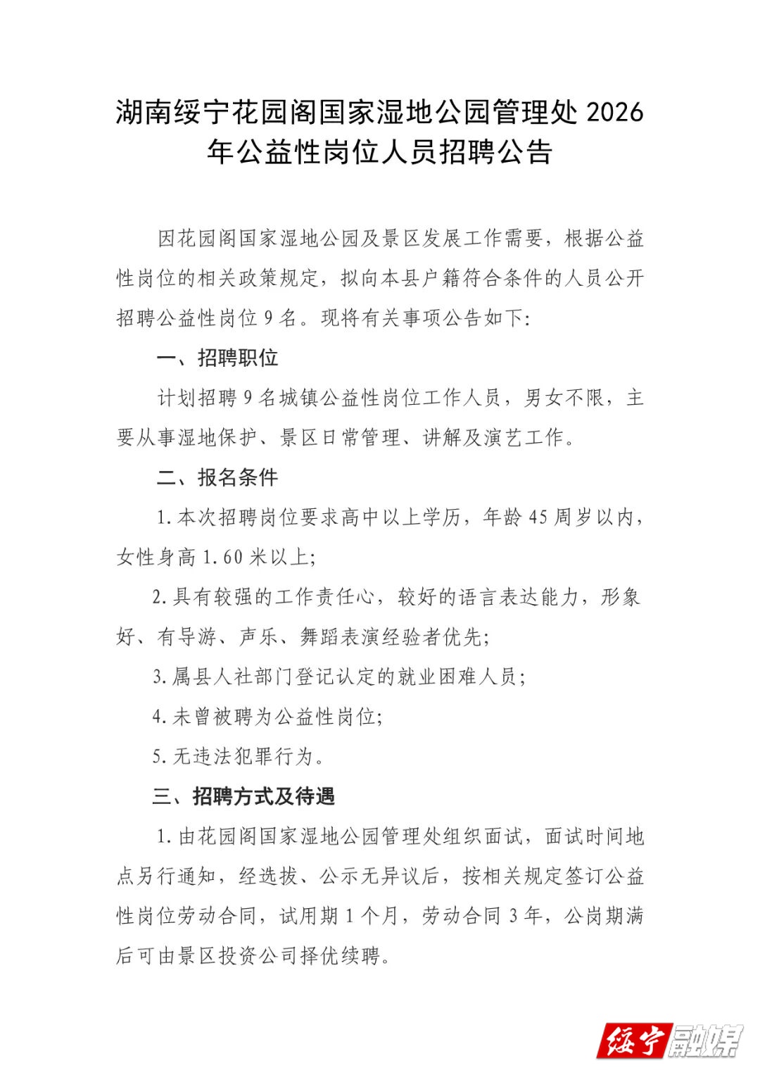 绥宁县花园阁国家湿地公园管理处2026年公益岗位人员招聘公告
