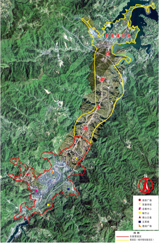 城市规划建设区。南以古罗大道花果山大桥为界;北至古丈县行政边界(栖凤湖段);东、西方向分别以龙吉高速(S99)、古罗大道为界。包括以龙吉高速(S99)、古罗大道为中心两侧200 米范围;罗依溪片区部分区域。