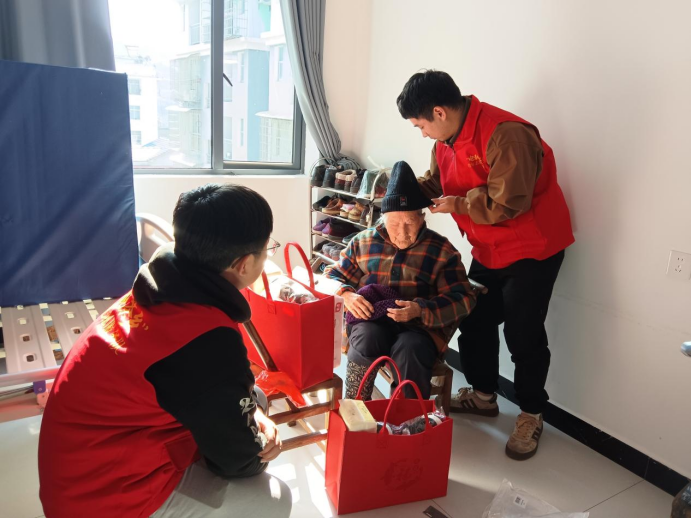 中午时分,阳光洒满敬老院的庭院,不少老人正围坐在一起晒太阳、拉家常。志愿者们手提棉鞋、棉帽、护手霜等精心准备的过冬物资走进院内,一边将慰问品送到每位老人手中,一边亲切询问他们的生活与身体近况。“爷爷,试试这顶帽子暖和吗?”“奶奶,最近身体还好吧?”声声问候中,暖意悄然流淌。