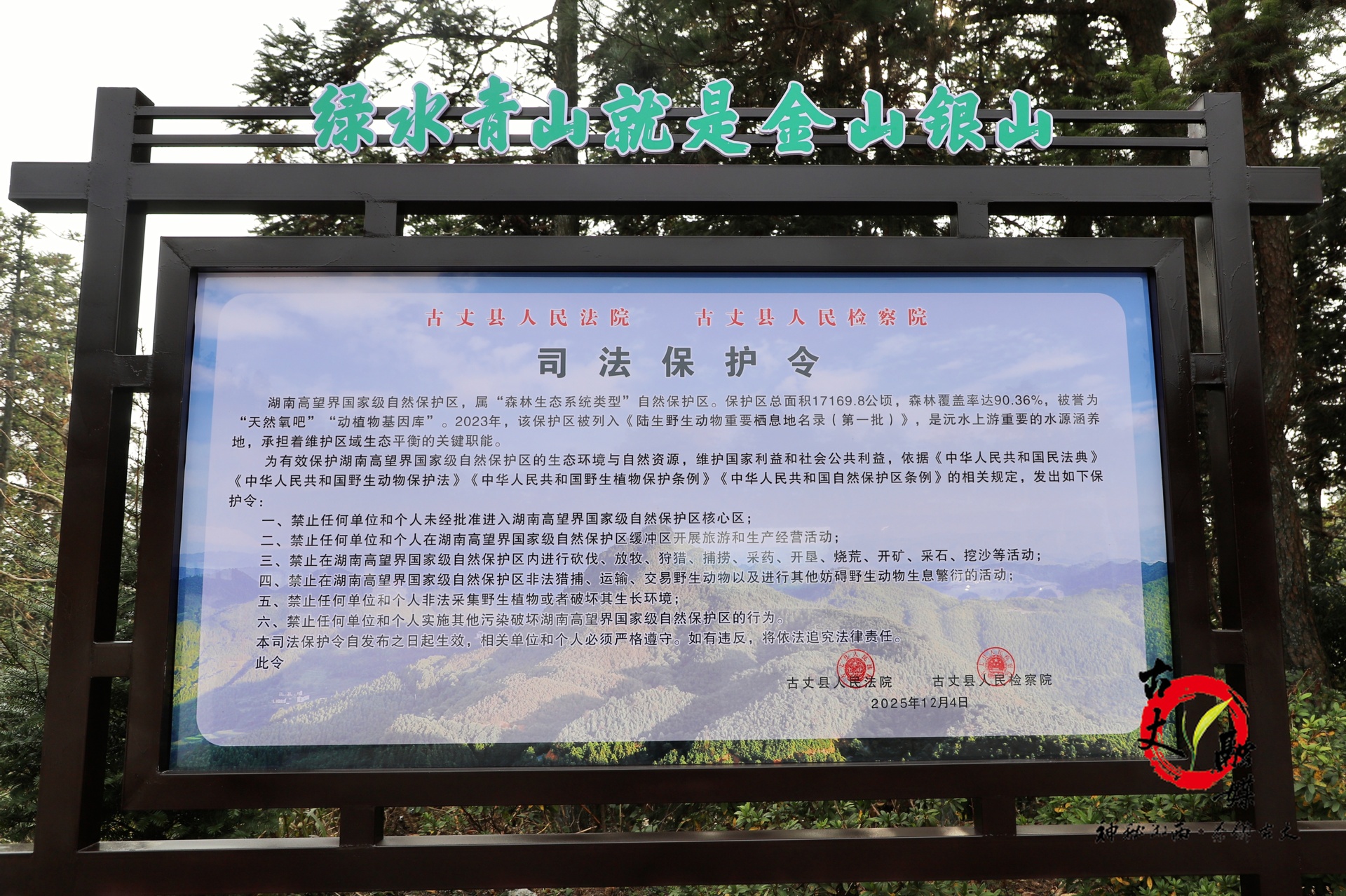 古丈融媒12月11日讯(通讯员 向铠浩 程慧)为进一步加强对湖南高望界国家级自然保护区的司法保护力度,严厉打击破坏生态环境的违法犯罪行为,近日,古丈县人民法院与古丈县人民检察院共同发布《司法保护令》,以司法利剑守护绿水青山,为保护区内的珍稀野生动植物及其栖息环境提供坚实法治保障。
