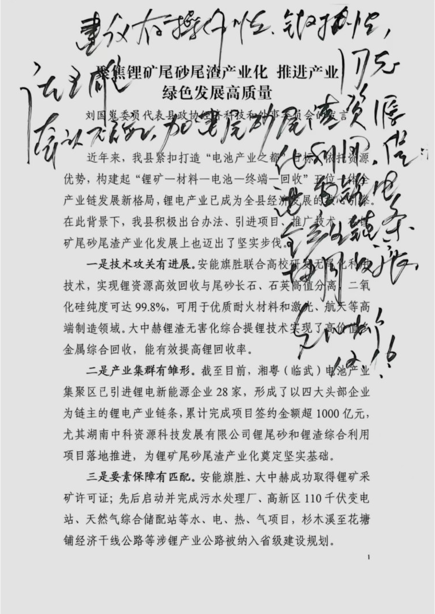 建议有操作性、针对性。请王雄同志牵头研究,加速尾砂尾渣资源化利用,促进锂电全产业链条协同发展。