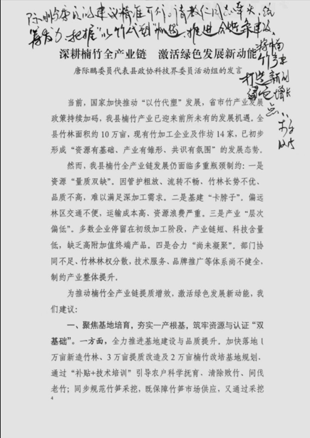 际鹏委员的建议精准可行。请教仁同志牵头,统筹发力,把握“以竹代塑”机遇,推进全链条建设,将楠竹产业打造新的绿色增长点。