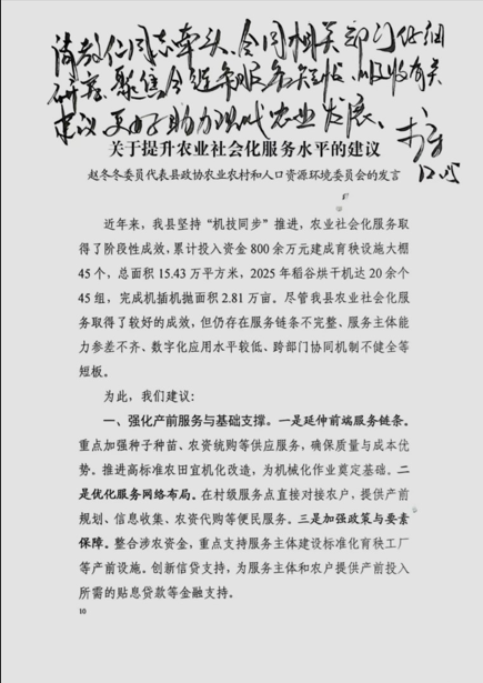 县政协委员赵冬冬代表县政协农业农村和人口资源环境委员会所作的《关于提升农业社会化服务水平的建议》发言,围绕农业社会化服务,跨部门协同机制不健全,提出了强化产前服务与基础支撑、提升产中机械化与智能化水平、着力产后增值与增效、建立健全全环节支撑保障等方面的建议。