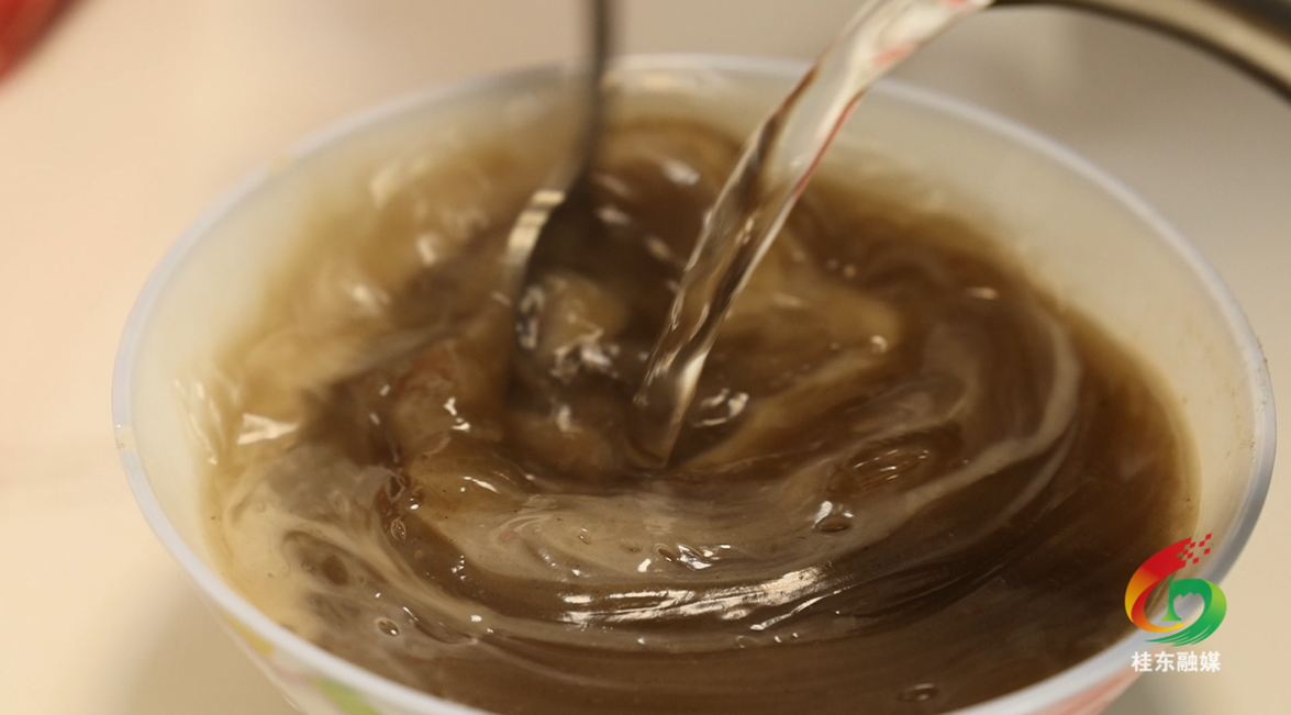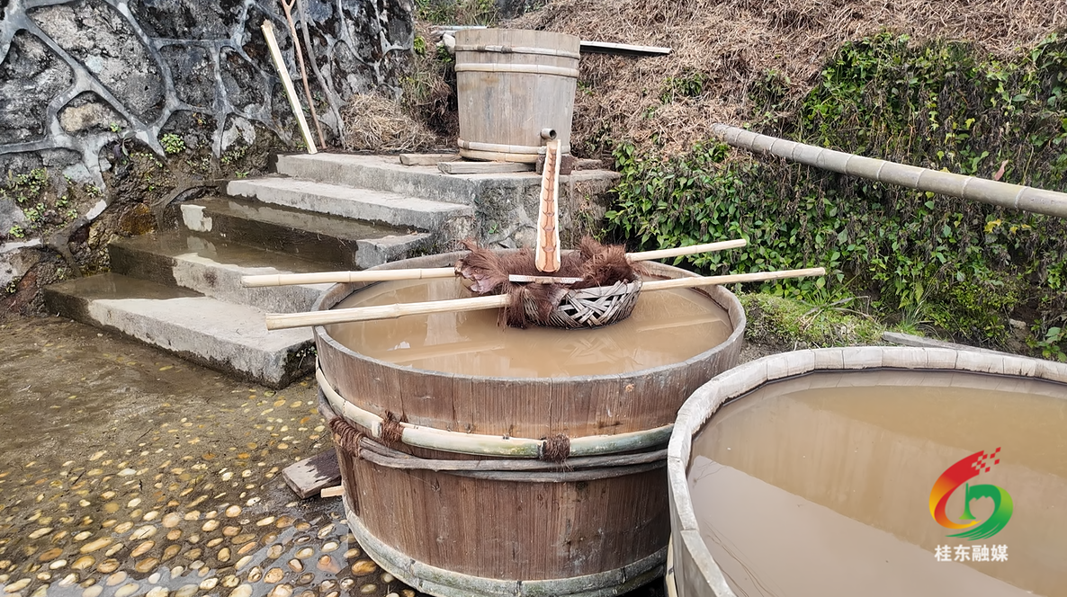 县融媒体中心主持人余妍:你看,经过捶打和初步过滤,我们的第一步就已经完成了。那接下来才是真正考验耐心的时刻,因为我们的蕨根浆要制作成蕨根粉还需要经历两次的沉淀,才能够真正得到最终需要的蕨根粉。