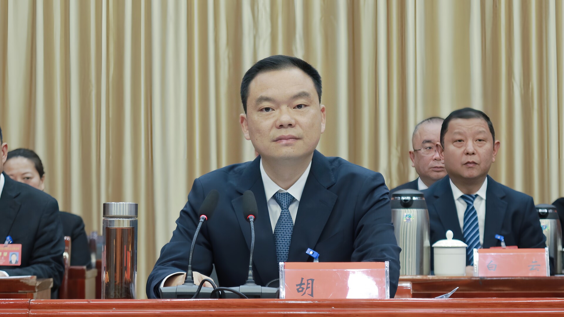 在主席台前排就座的领导有:胡杰、周华特、杨凯程、张必忠、向付和、邓小健、张小明、彭静、尹秀常、李卫东。