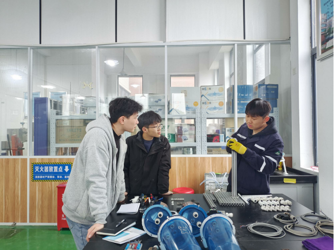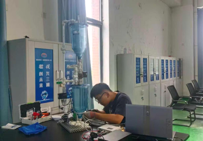 入校第二周,刘高阳便主动申请并通过考核进入学校水处理集训队,成为校集训队年龄最小的队员。教练梁美东老师记得,第一次做混凝搅拌实验,其他人还在摸索仪器,这个小伙子已经就能进行六联搅拌器的设定操作了;当同学们回宿舍休息时,他仍在反复练习玻璃器皿的“零挂壁”冲洗,只为缩短 30 秒准备时间;英文基础薄弱,他就在指导老师的指引下把 200 多页的水处理常用词汇抄成“口袋本”,逐词标注;泵管拆卸时割破手指,他简单包扎后继续钻进管路系统,实实在在地把冷板凳坐成了热炕头。渐渐地在老师的精心指导下,他从电仪技术小白转变成熟练玩转竞赛所需的安装、接线、调试操作的“熟练工”。令教练老师们印象最深刻的是,刘高阳喜欢跟集训队的同学们进行各模块准确度、速度PK。2024年正月,已返回老家的刘高阳,得知学长正在国家队集训,他立马赶赴开封与学长会合,尽管天寒地冻,他始终保持高昂的情绪,白天跟着学长现场观摩学习,晚上把学校基地所没有的EDS设备借回宾馆,在老师的指导下按国家集训队要求进行训练,目标就是直指国赛冲出重围,实现梦想。