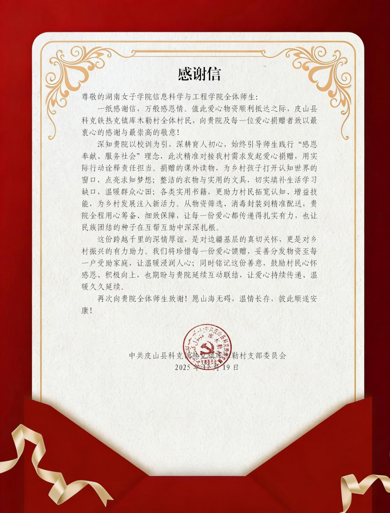 近日,一封来自新疆皮山县科克铁热克镇库木勒村党支部的感谢信,跨越千山万水送达湖南女子学院,字里行间满含对该校信息科学与工程学院师生的真挚谢意,为“懿德传情,旧物暖疆”爱心捐赠活动画上温暖句点。