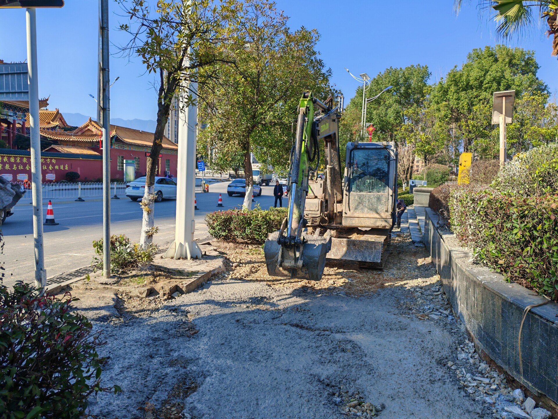 洞口融媒1月14日讯(记者:胡涛)1月13日,我县松坡大桥沿江风光带人行道维修工程正抢抓晴好天气加紧推进。施工现场,原有松动破损的地砖已全部清理完毕,施工已进入基层处理关键阶段。工人们有序进行基层压实、水泥砂浆拌合与垫层摊铺作业,挖掘机轰鸣配合,各环节紧密衔接,确保垫层平整坚固,为后续地砖铺设奠定基础。