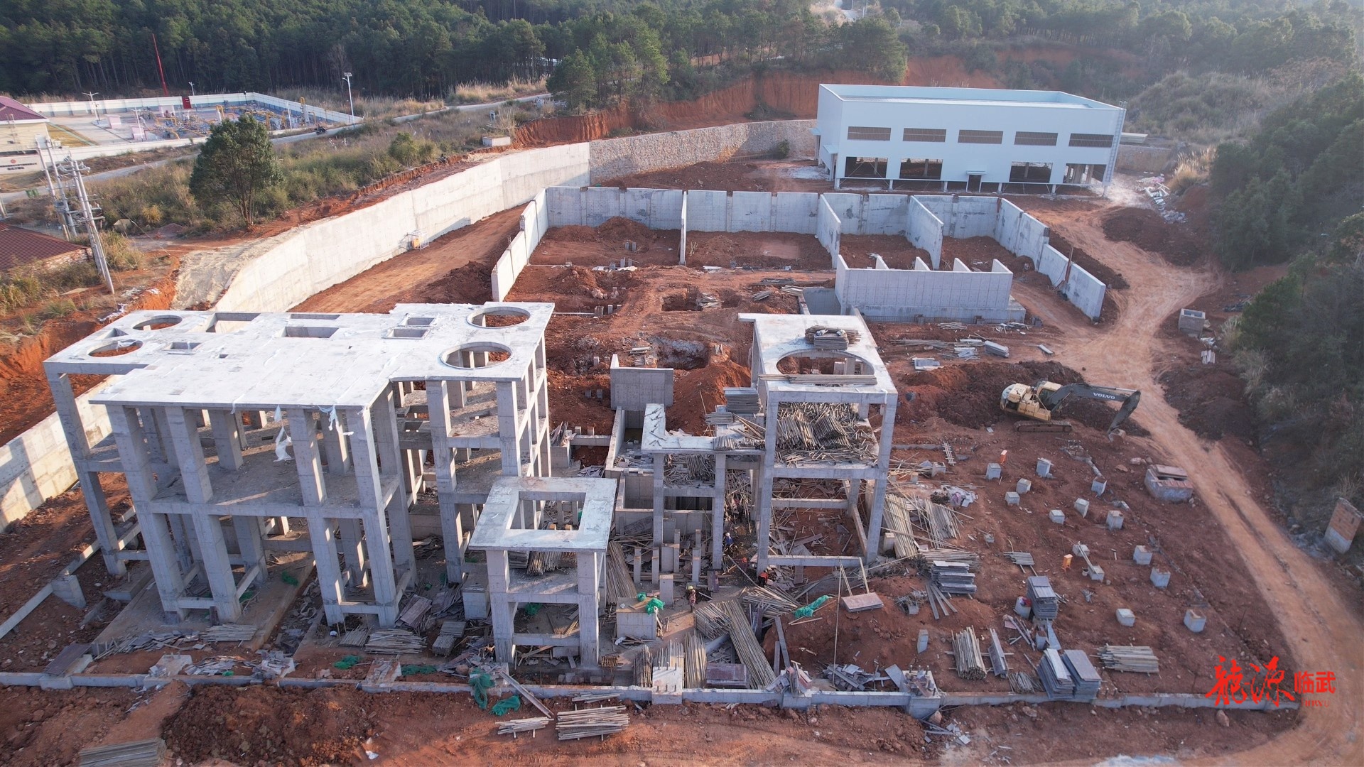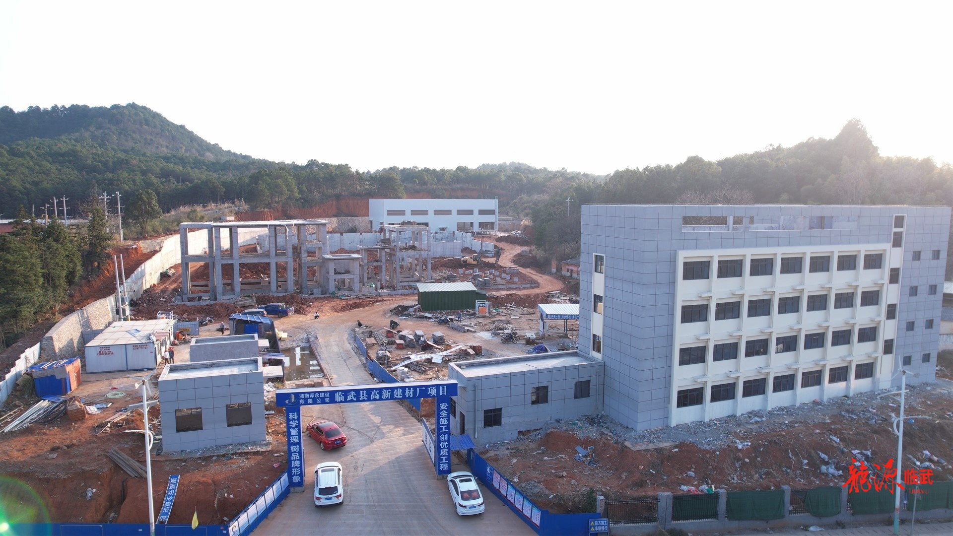 临武县高新建材有限公司现场管理人员曾梓航介绍,现在主体项目完成了90%,办公楼进入装修阶段,设备基础建设已完成,接下来进行设备安装及调试,现场施工人员有20名和两台挖掘机,预计年后试运营。