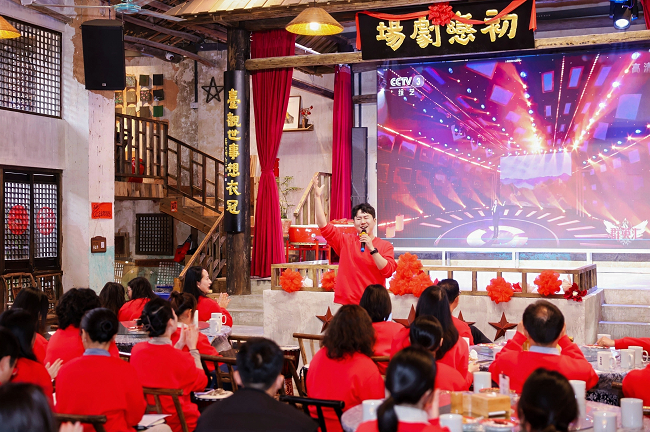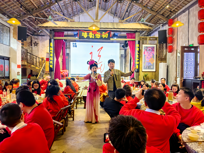 活动尾声,张景贤携手开慧镇非遗花鼓戏驻场演员,在传统古戏台上演绎《刘海砍樵·比古调》。他不仅担任表演场,更以专业视角解析唱腔中的湖湘语言韵律与民间审美逻辑,让国家级非遗从展演品转化为可参与、可传承的生活化文化实践。这一环节打通了“课堂—场馆—社区”三重空间,实现古色非遗在文旅场景中的真实活化。