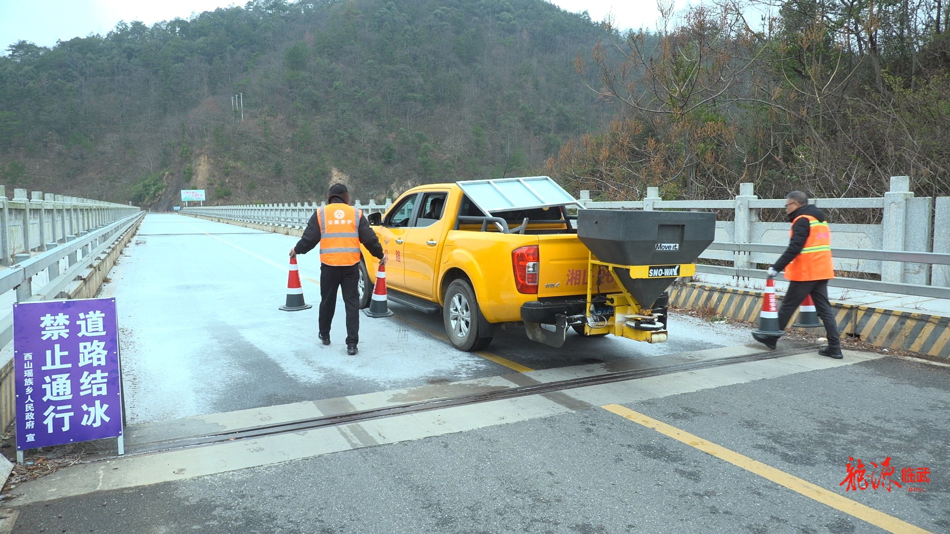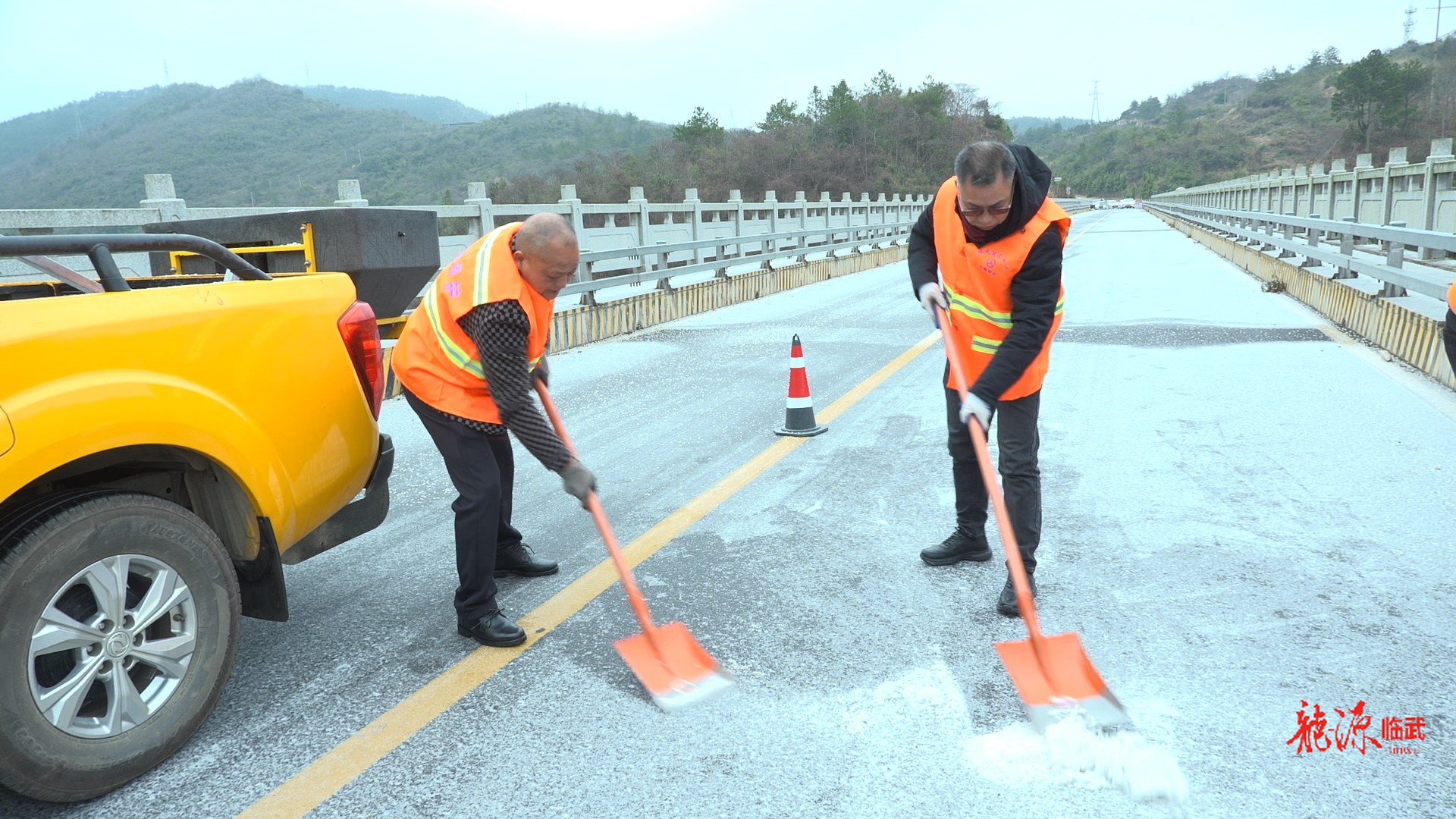 面对寒潮,临武县公路建设养护中心抢险队员奔赴一线,在武水镇同益中桥、牛石墩桥及西瑶乡石子坪大桥等重点路段,顶着寒风开展除冰作业。现场,融雪剂撒布机沿路铺撒融雪剂,对于机械难以覆盖的弯道、路肩等区域,队员们手持工具人工除冰,加快冰雪消融,全力恢复道路通畅。