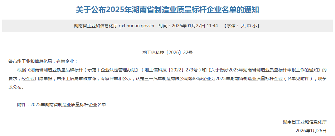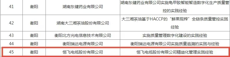 近日,湖南省工业和信息化厅正式公布《2025年度湖南省制造业质量标杆企业名单》,其中,雁峰区恒飞电缆股份有限公司凭借“恒飞电缆股份有限公司精益化管理实践经验”成功入选该名单。