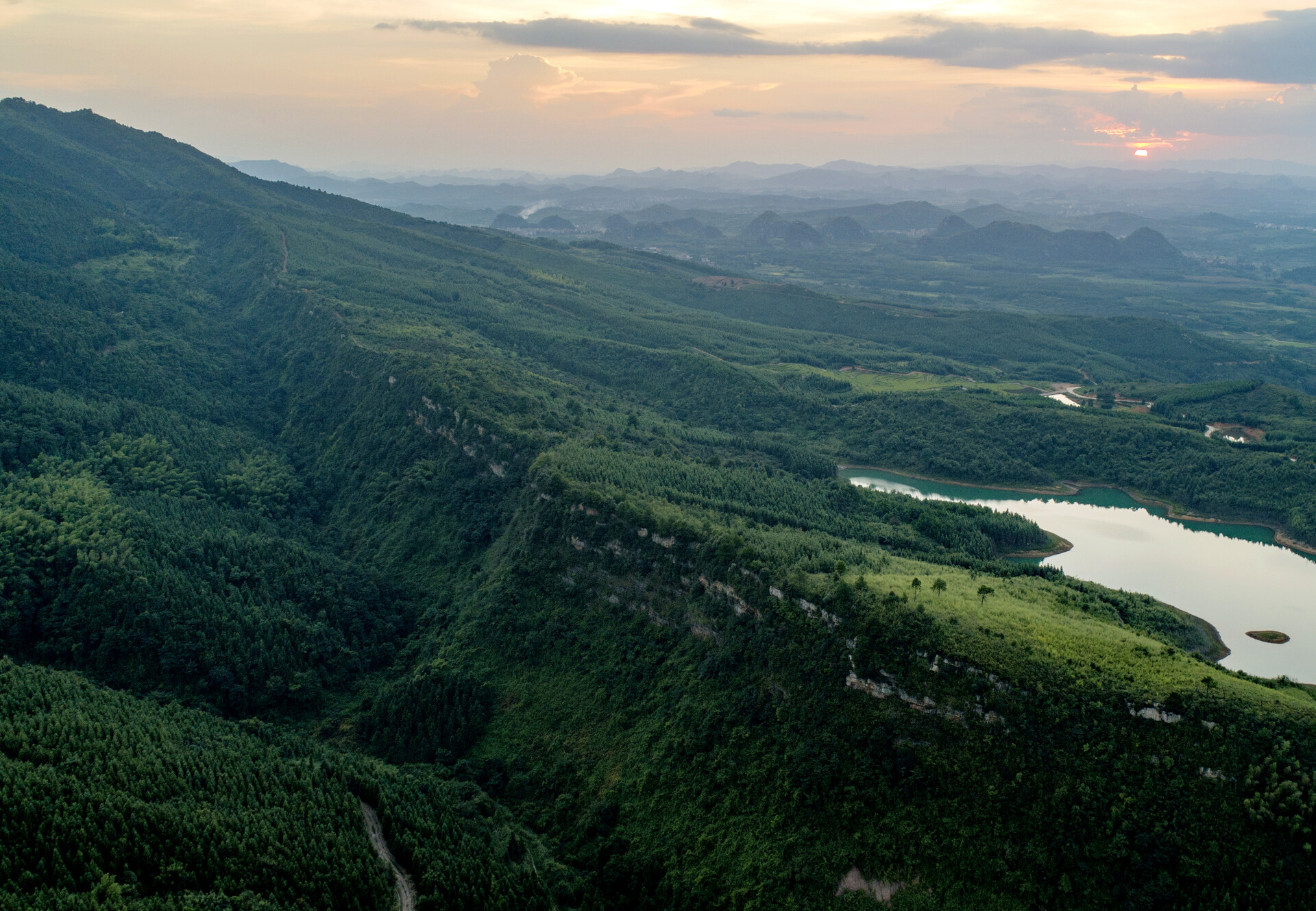 “晋屏晚翠”堪称造物主的妙笔,立于县城远眺,以尖峰岭为轴,南侧山峦在夕照中勾勒出一尊静谧安详的女睡佛轮廓,北侧峰岭则化为一尊雄浑伟岸的男巨佛身影,一阴一阳在落日余晖中达成完美的视觉平衡,令人感叹天地法则的神奇。清康熙年间嘉禾县知县陈祥祚的诗句“新月半临峰色丽,夕阳斜照岫容鲜”,正是对此景的千古共鸣。