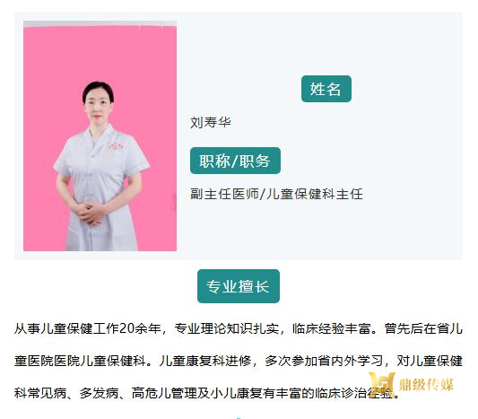 儿童保健科专家:聚焦儿童生长发育评估、营养指导、行为发育干预及预防接种指导,为宝宝的成长关键期,提供个性化、全方位的保健服务,助力宝宝健康聪慧、稳步成长。