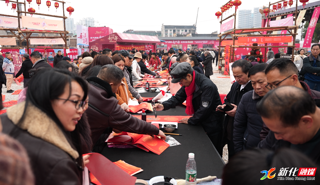 活动现场,邹剑锋现场发布“新化年味地图”,杨维宣布年俗市集开街,并为步升科技、国梁米业等30家代表企业授牌“诚信年货商家联盟”。鄢福初与本土书法家现场挥毫赠“福”,共同书写新春祝福;梅山武术《村武英雄》、傩狮《龙行紫鹊》等非遗展演震撼亮相,女声独唱《唱首歌来祝福你》、山歌对唱等节目点燃现场氛围。互动环节中,领导嘉宾与游客共同体验打糍粑、水磨豆腐、写春联等民俗项目,吊锅茶寿宴香气四溢,福禄寿喜财“五面鼓”开街巡游更将传统年味推向高潮。