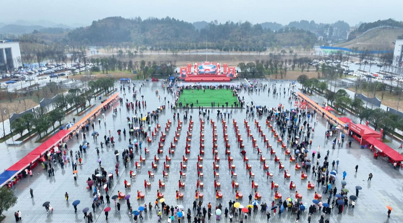 上午9时50分,暖场活动热闹开场。震天的迎宾锣鼓点燃现场气氛,色彩艳丽的舞龙队伍翻腾跳跃,与身着传统服饰的汉服巡游快闪队伍交相辉映,引得市民纷纷驻足拍照。广场大屏循环播放的文旅宣传片,全景展现了洞口雪峰蜜桔的丰收盛景、罗溪瑶寨的民俗风情与“棕包脑”非遗的独特魅力,让观众提前领略了县域文旅融合的丰硕成果。