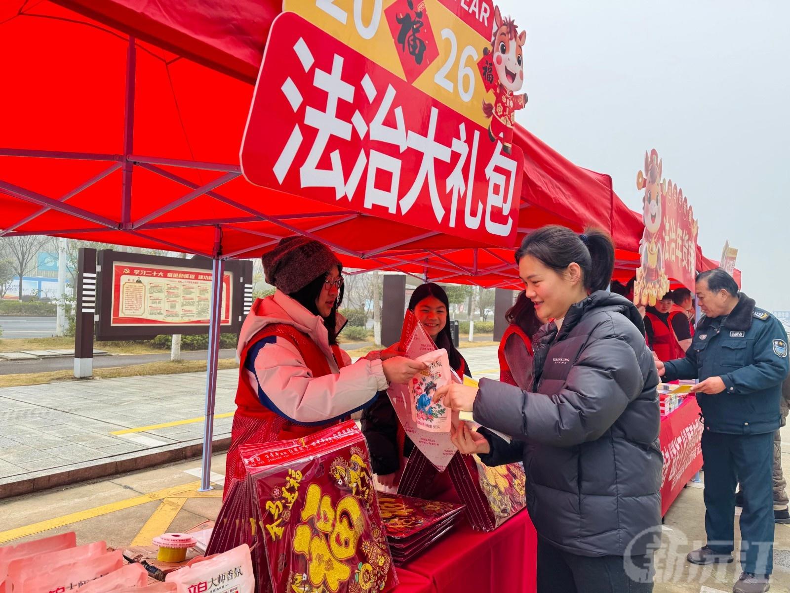 一旁的“法治大礼包”派发区同样气氛热烈。大学生志愿者们将精心准备的“平安福袋”递到群众手中,袋中装有《民法典要点解读》《防诈骗指南》等实用资料。接过翰墨飘香的法治春联和“法”字福贴,市民们脸上洋溢着笑容:“这年货实在,既学知识又添福气!”