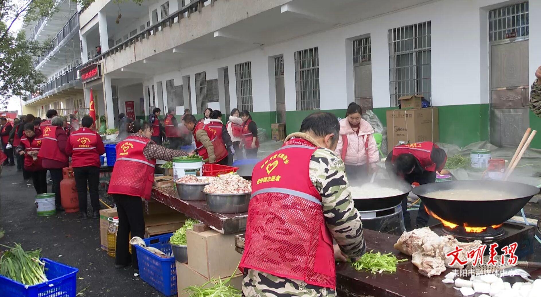 为了让大家感受团圆暖意,淝田镇各村的志愿者们天不亮就赶到现场,清晨五点多便已忙碌不停。洗菜、切菜、生火、掌勺,大家分工明确、配合默契,一张张长桌依次排开,一口口大锅热气腾腾,新鲜的食材在大家手中变成充满家乡风味的美味菜肴。志愿者蒋利春说:“我是淝美村的,我们5点多钟都到现场来准备食材,然后准备烧火做饭,让游客高高兴兴地来,高高兴兴地回去,体现一下过年的年味,欢迎大家过来。”