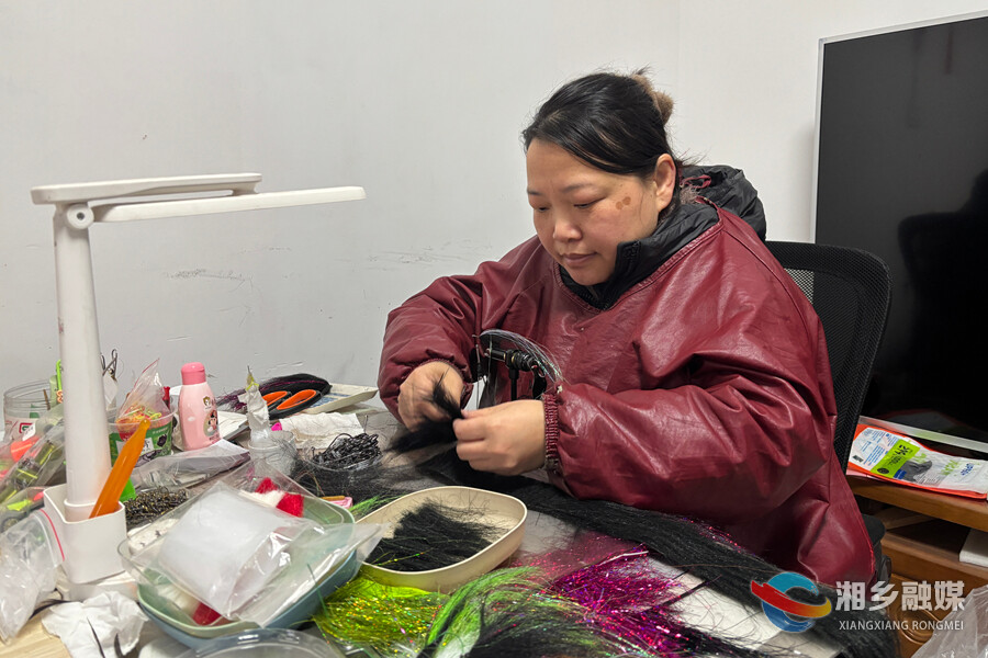一根细线、一枚弯钩,从百姓家连向车间,从湘乡通往世界。这些纯手工制作的飞蝇拟饵,历经选料、塑形、上色等多道精细工序,成为欧美、东南亚户外垂钓市场的“香饽饽”,也稳稳“钩”起了乡亲们家门口的致富路。