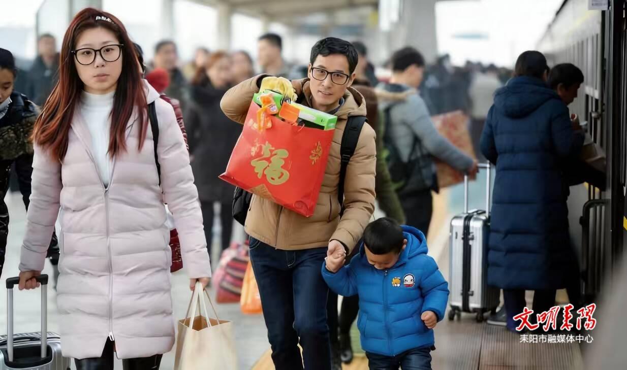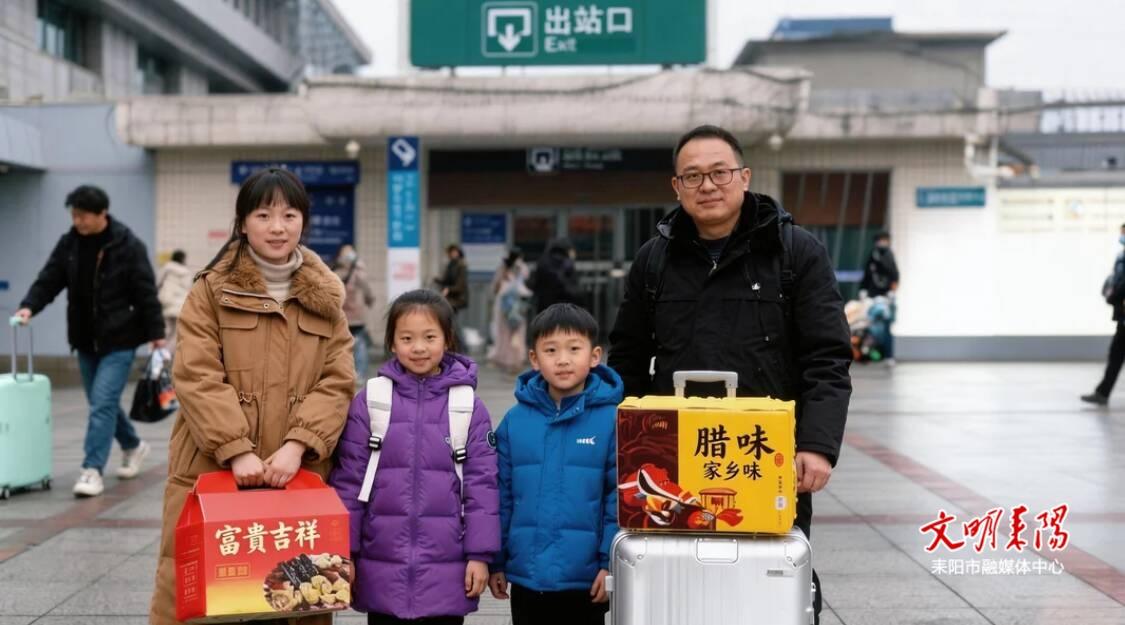 耒阳火车站出站口人流如织。拖着行李箱、提着大包小包的旅客步履匆匆,脸上洋溢着回家的喜悦。在广州从事装修多年的周先生刚走出站,便见到前来迎接的家人。他一手推行李箱,一手拎着两大袋广式腊味和莲蓉糕点。“在广州忙活一年,还算顺利。带点本地特产,给家里人尝个新鲜。”他笑着将零食塞到孩子手中,孩子捧着果干,笑得眼睛眯成了缝。
