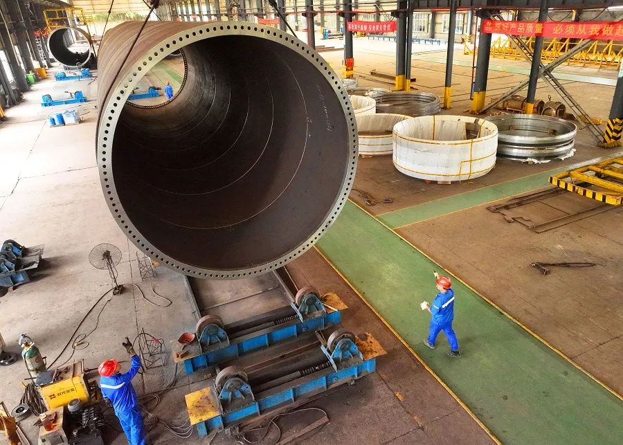 8月28日,衡山县高新技术产业开发区恒岳重钢钢结构工程有限公司,员工在生产风电塔筒装备。今年以来,该公司订单式生产的风力发电机组塔筒设备供需两旺,公司开足马力生产,助力新能源建设与发展。曹正平 陈亮 摄影报道