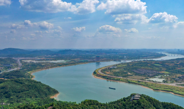 从长株潭生态绿心——昭山森林公园远眺湘江,天空澄澈,草木葱茏,蓝天白云下,两岸风光旖旎。(来源/网络)